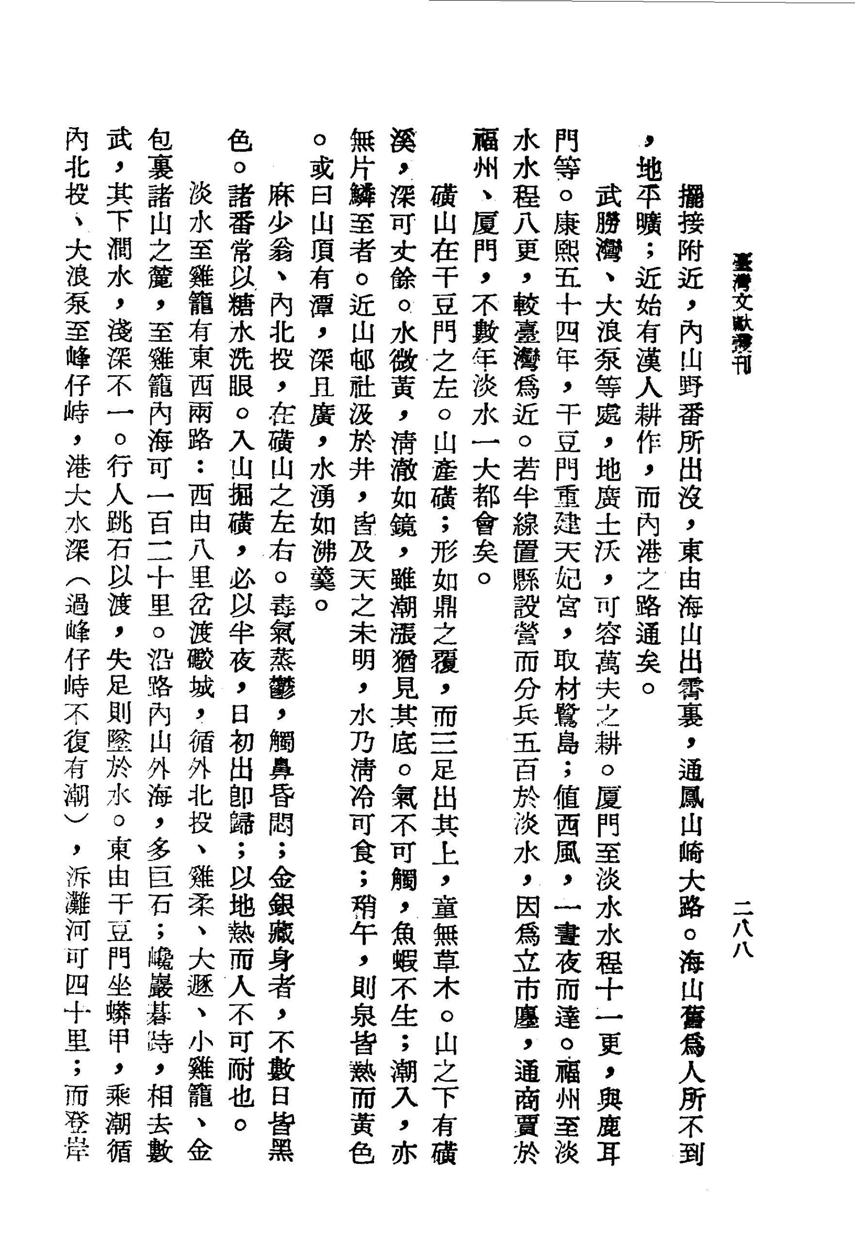 麻少翁、內北投,在磺山之左右.毒氣蒸鬱,觸鼻昏悶;金銀藏身者,不數日皆黑色.諸番常以糖水洗眼.入山掘磺,必以半夜,日初出即歸;以地熱而人不可耐也.