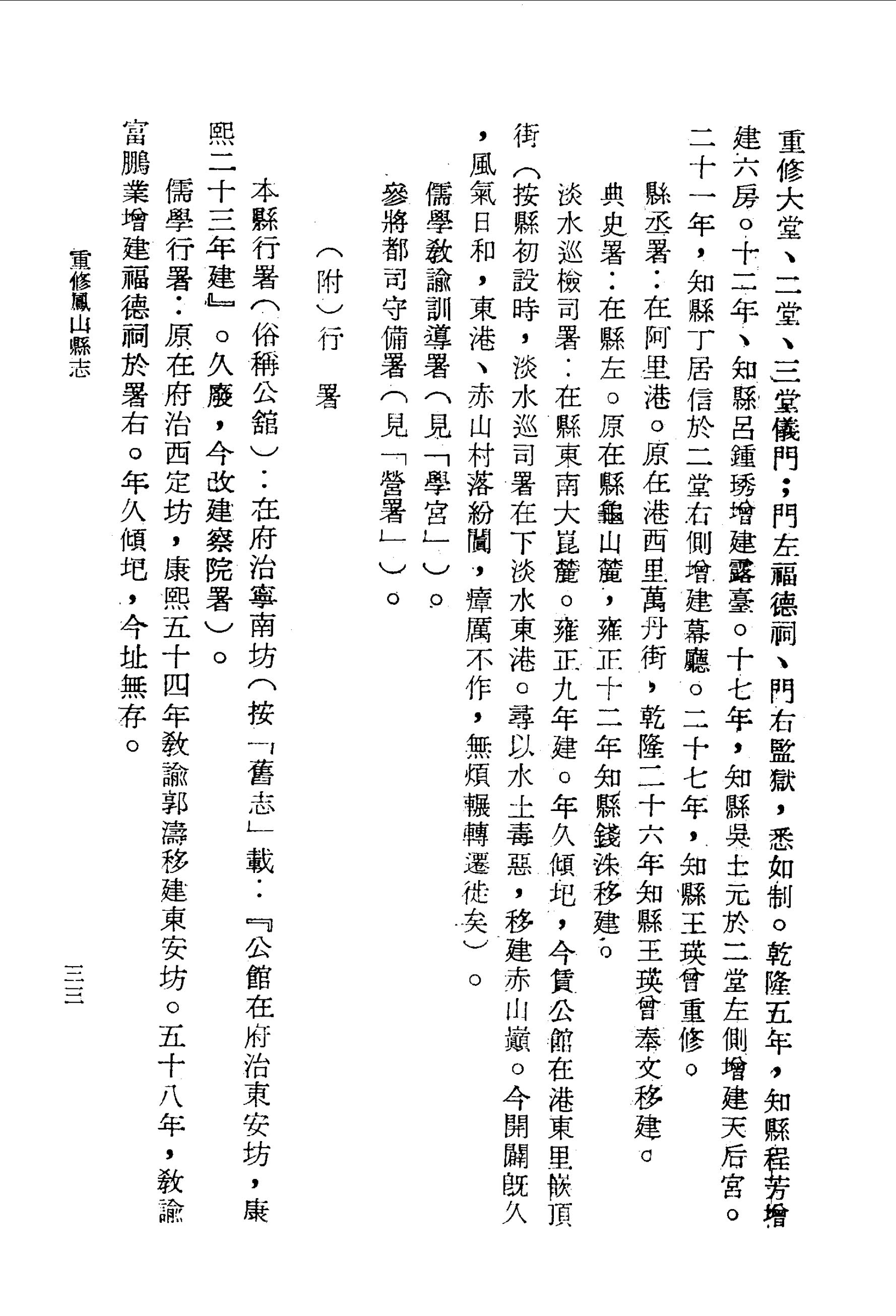 淡水巡檢司署:在縣東南大崑麓.雍正九年建.年久傾圮,今賃公館在港東里嵌頂街(按縣初設時,淡水巡司署在下淡水東港.尋以水土毒惡,移建赤山巔.今開闢既久,風氣日和,東港、赤山村落紛闐,瘴厲不作,無煩輾轉遷徙矣).