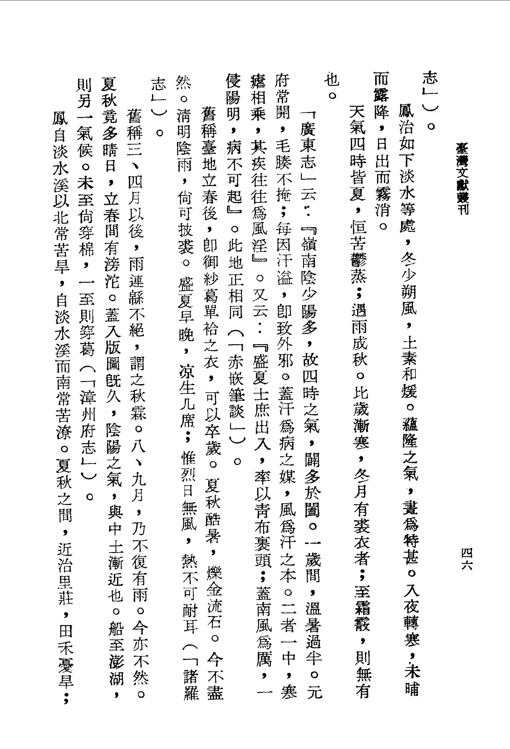 「廣東志」云:『嶺南陰少陽多,故四時之氣,闢多於闔.一歲間,溫暑過半.元府常開,毛腠不掩;每因汗溢,即致外邪.蓋汗為病之媒,風為汗之本.二者一中,寒瘧相乘,其疾往往為風淫』.又云:『盛夏士庶出入,率以青布裹頭;蓋南風為厲,一侵陽明,病不可起』.此地正相同(「赤嵌筆談」).