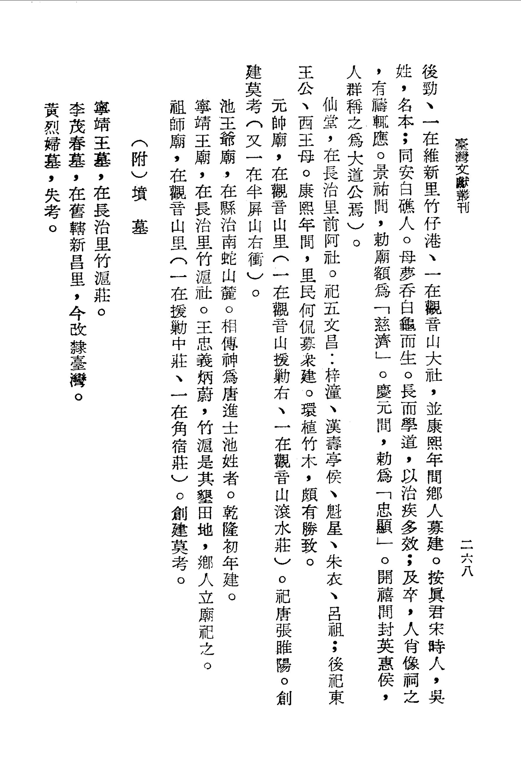 按真君宋時人,吳姓,名本;同安白礁人.母夢吞白龜而生.長而學道,以治疾多效;及卒,人肖像祠之,有禱輒應.景祐間,敕廟額為「慈濟」.慶元間,敕為「忠顯」.開禧間封英惠侯,人群稱之為大道公焉).