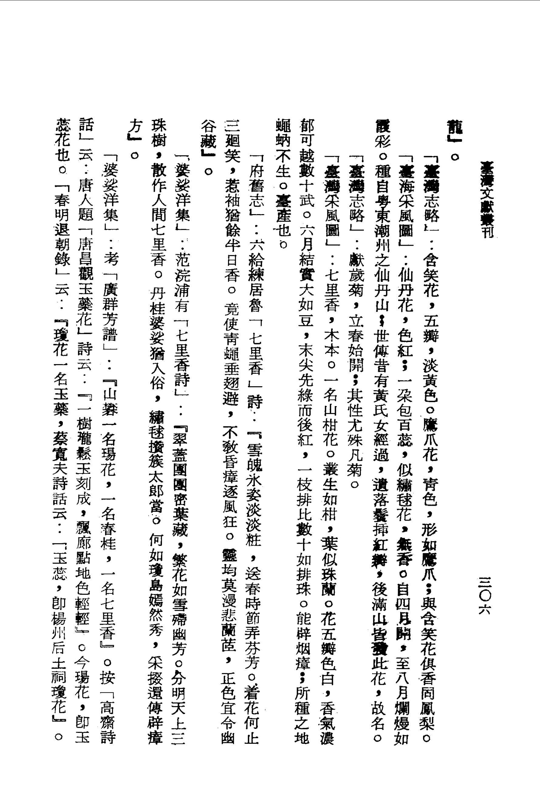「臺灣采風圖」:七里香,木本.一名山柑花.叢生如柑,葉似珠蘭.花五瓣色白,香氣濃郁可越數十武.六月結實大如豆,末尖先綠而後紅,一枝排比數十如排珠.能辟烟瘴;所種之地蠅蚋不生.臺產也.