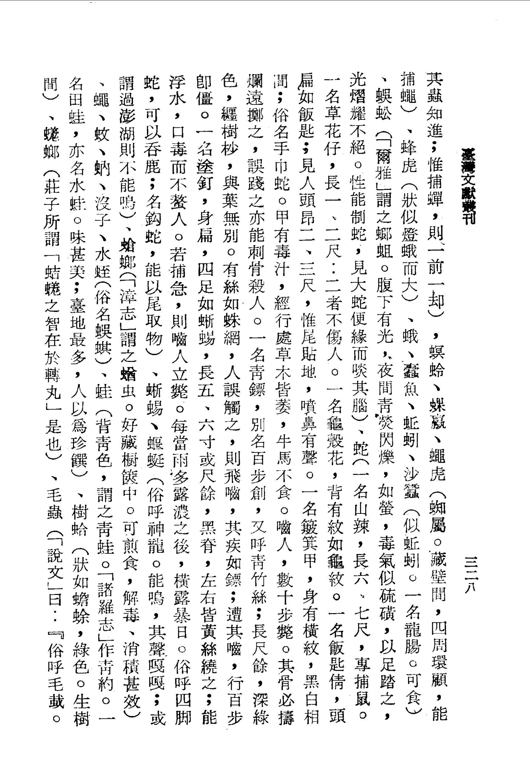 蛇(一名山辣,長六、七尺,專捕鼠.一名草花仔,長一、二尺:二者不傷人.一名龜殼花,背有紋如龜紋.一名飯匙倩,頭扁如飯匙;見人頭昂二、三尺,惟尾貼地,噴鼻有聲.一名簸箕甲,身有橫紋,黑白相間;俗名手巾蛇.甲有毒汁,經行處草木皆萎,牛馬不食.嚙人,數十步斃.其骨必擣爛遠擲之,誤踐之亦能刺骨殺人.一名青鏢,別名百步創,又呼青竹絲;長尺餘,深綠色,纏樹杪,與葉無別.有絲如蛛網,人誤觸之,則飛嚙,其疾如鏢;遭其嚙,行百步即僵.一名塗釘,身扁,四足如蜥蜴,長五、六寸或尺餘,黑脊,左右皆黃絲繞之;能浮水,口毒而不螯人.若捕急,則嚙人立斃.每當雨多露濃之後,橫露暴日.俗呼四腳蛇,可以吞鹿;名鉤蛇,能以尾取物)