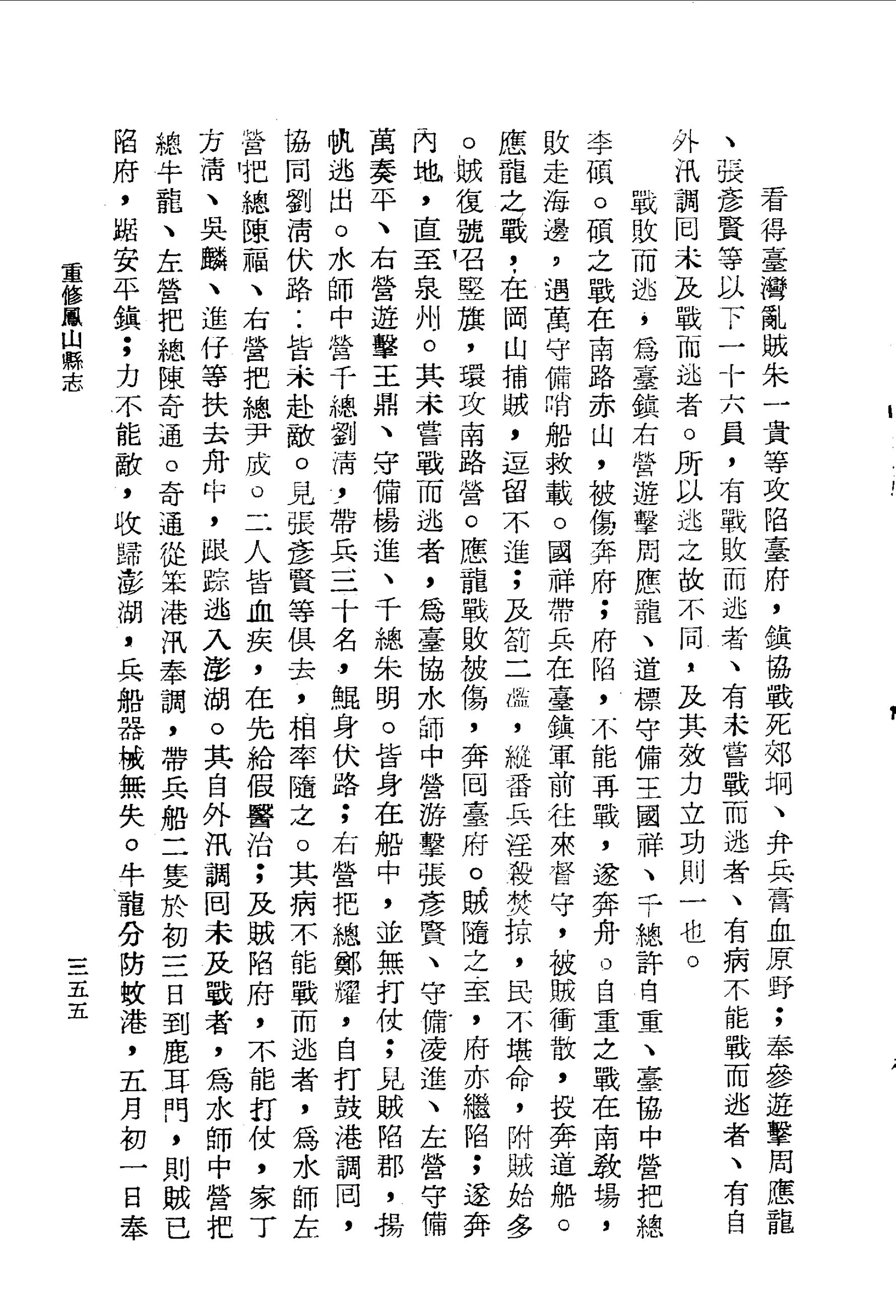 二人皆血疾,在先給假醫治;及賊陷府,不能打仗,家丁方清、吳麟、進仔等扶去舟中,跟蹤逃入澎湖.