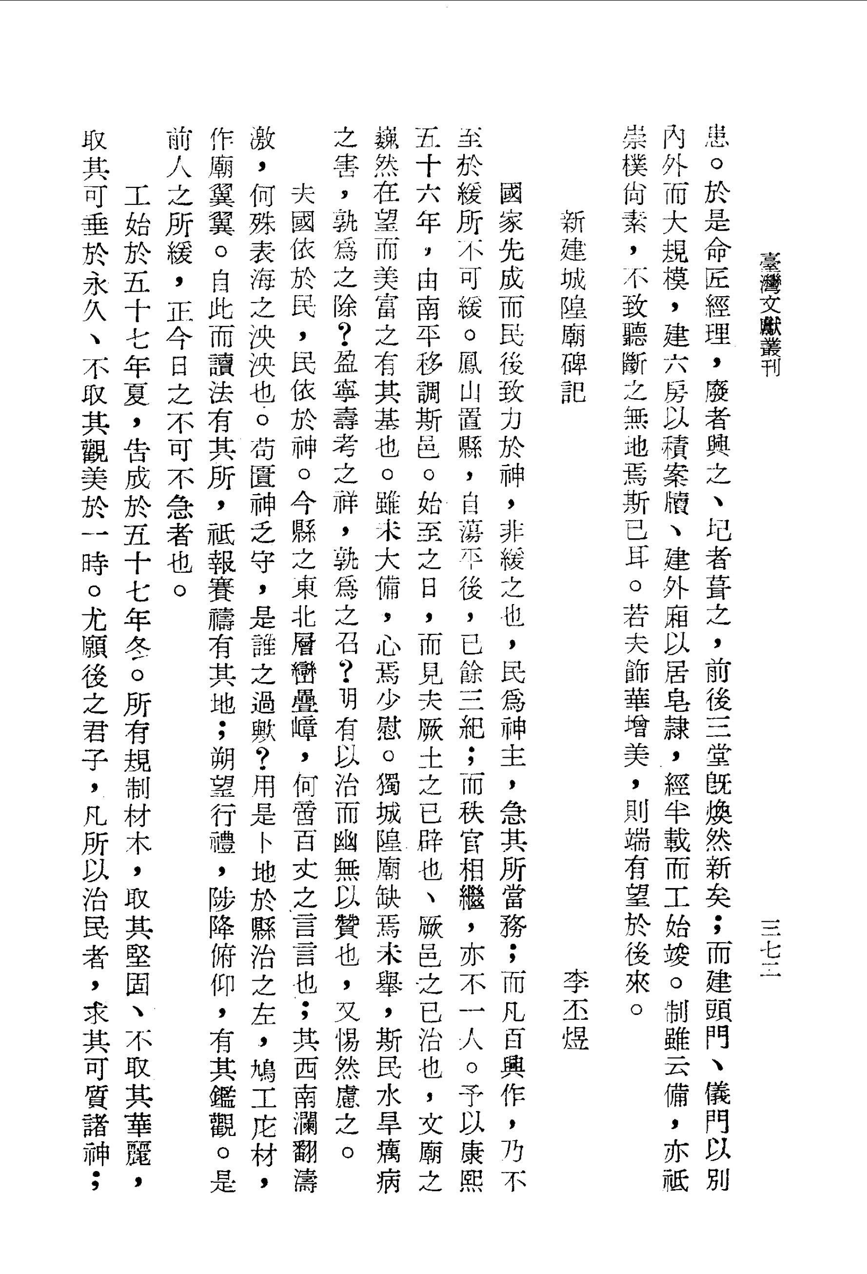 予以康熙五十六年,由南平移調斯邑.始至之日,而見夫厥土之已辟也、厥邑之已治也,文廟之巍然在望而美富之有其基也.雖未大備,心焉少慰.獨城隍廟缺焉未舉,斯民水旱癘病之害,孰為之除?盈寧壽考之祥,孰為之召?明有以治而幽無以贊也,又惕然慮之.