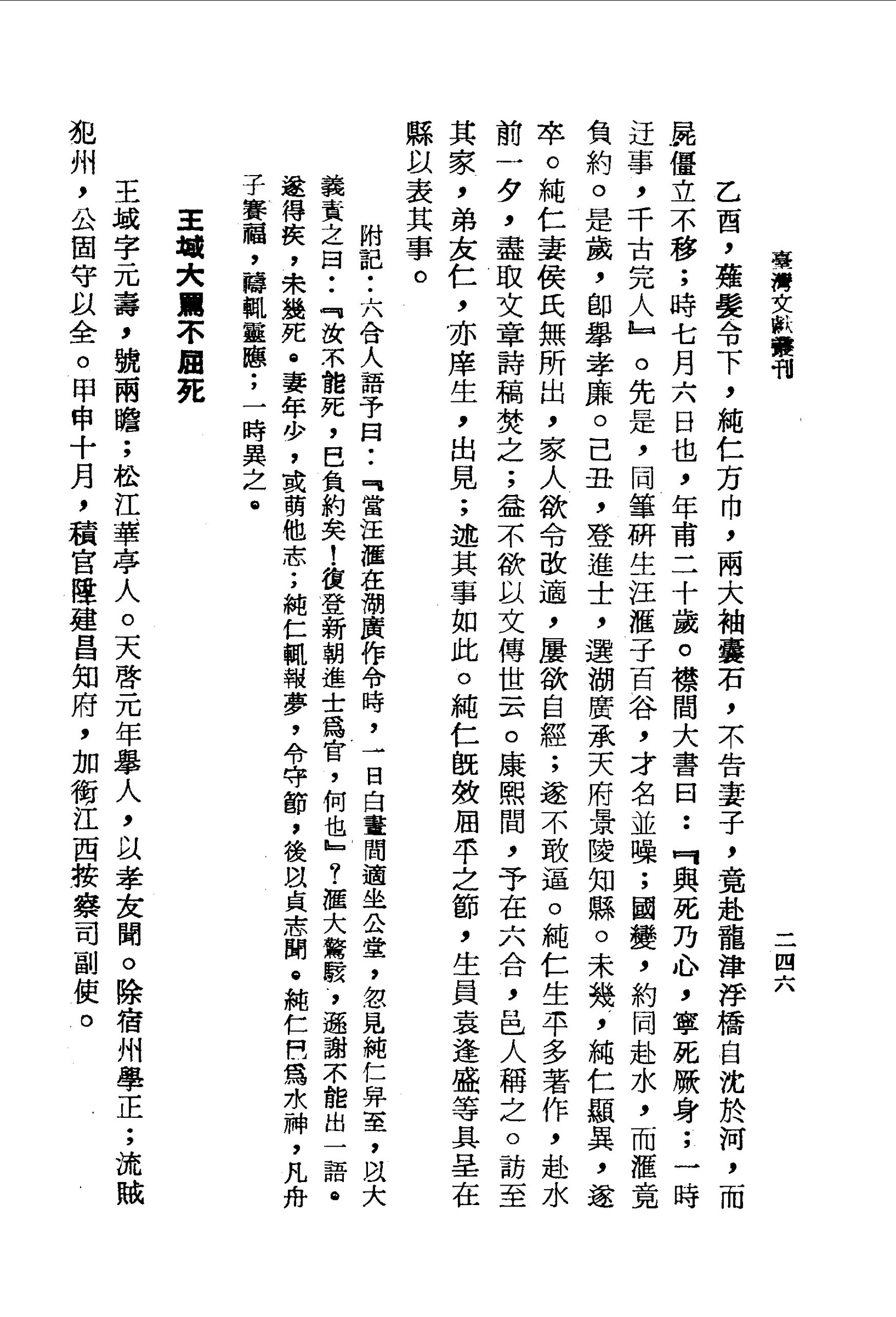 當汪匯在湖廣作令時,一日白晝間適坐公堂,忽見純仁舁至,以大義責之曰:『汝不能死,已負約矣!復登新朝進士為官,何也』?匯大驚駭,遜謝不能出一語。遂得疾,未幾死。
