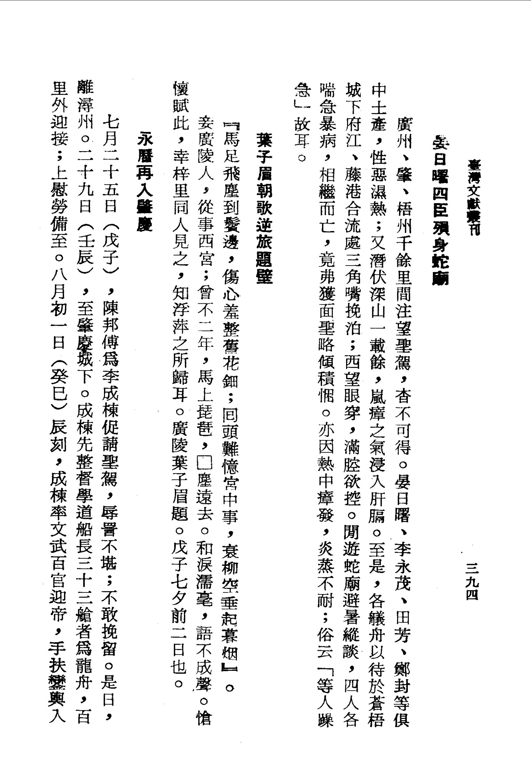 廣州、肇、梧州千餘里間注望聖駕,杳不可得。晏日曙、李永茂、田芳、鄭封等俱中土產,性惡濕熱;又潛伏深山一載餘,嵐瘴之氣浸入肝膈。至是,各艤舟以待於蒼梧城下府江、藤港合流處三角嘴挽泊;西望眼穿,滿腔欲控。閒遊蛇廟避暑縱談,四人各喘急暴病,相繼而亡,竟弗獲面聖略傾積悃。亦因熱中瘴發,炎蒸不耐;俗云「等人躁急」故耳。