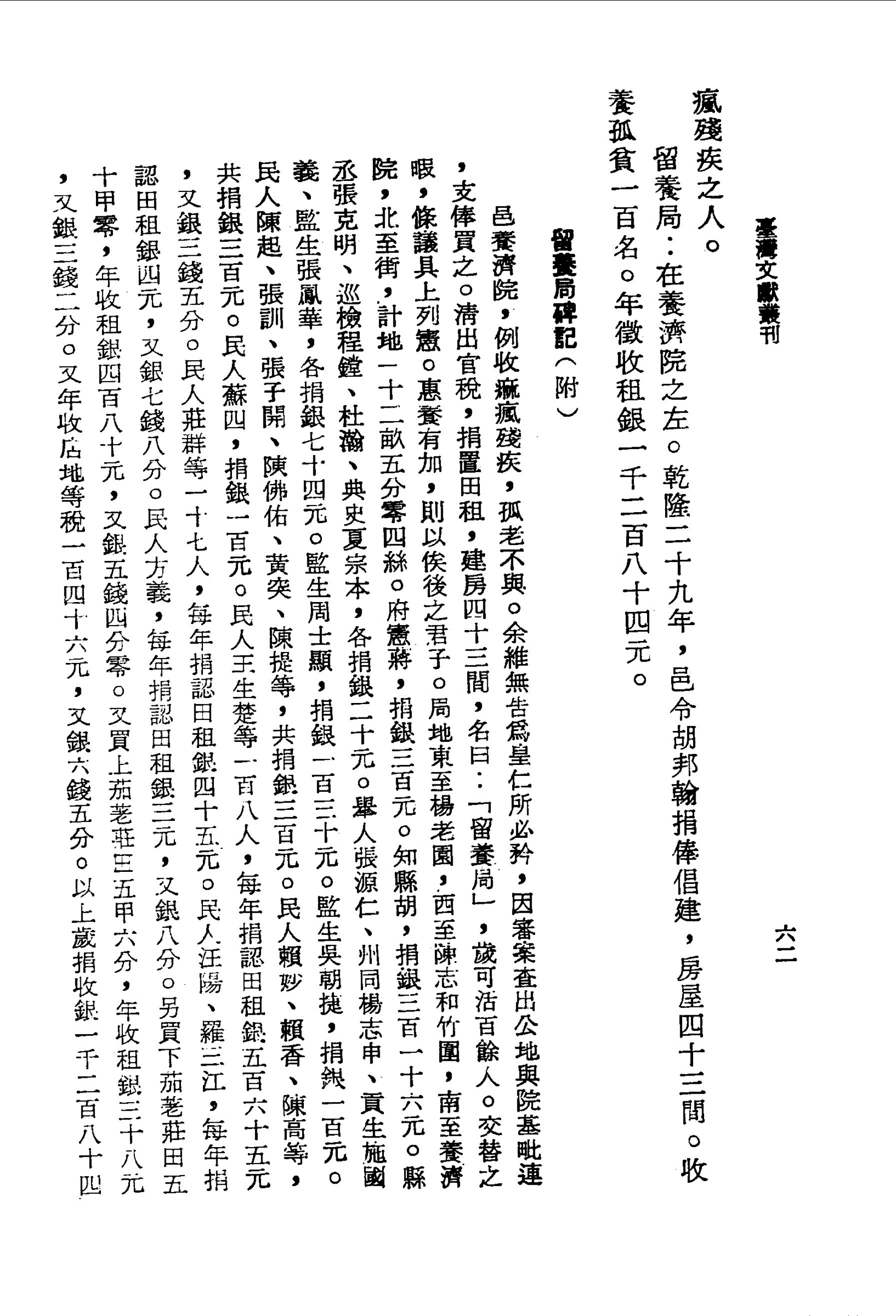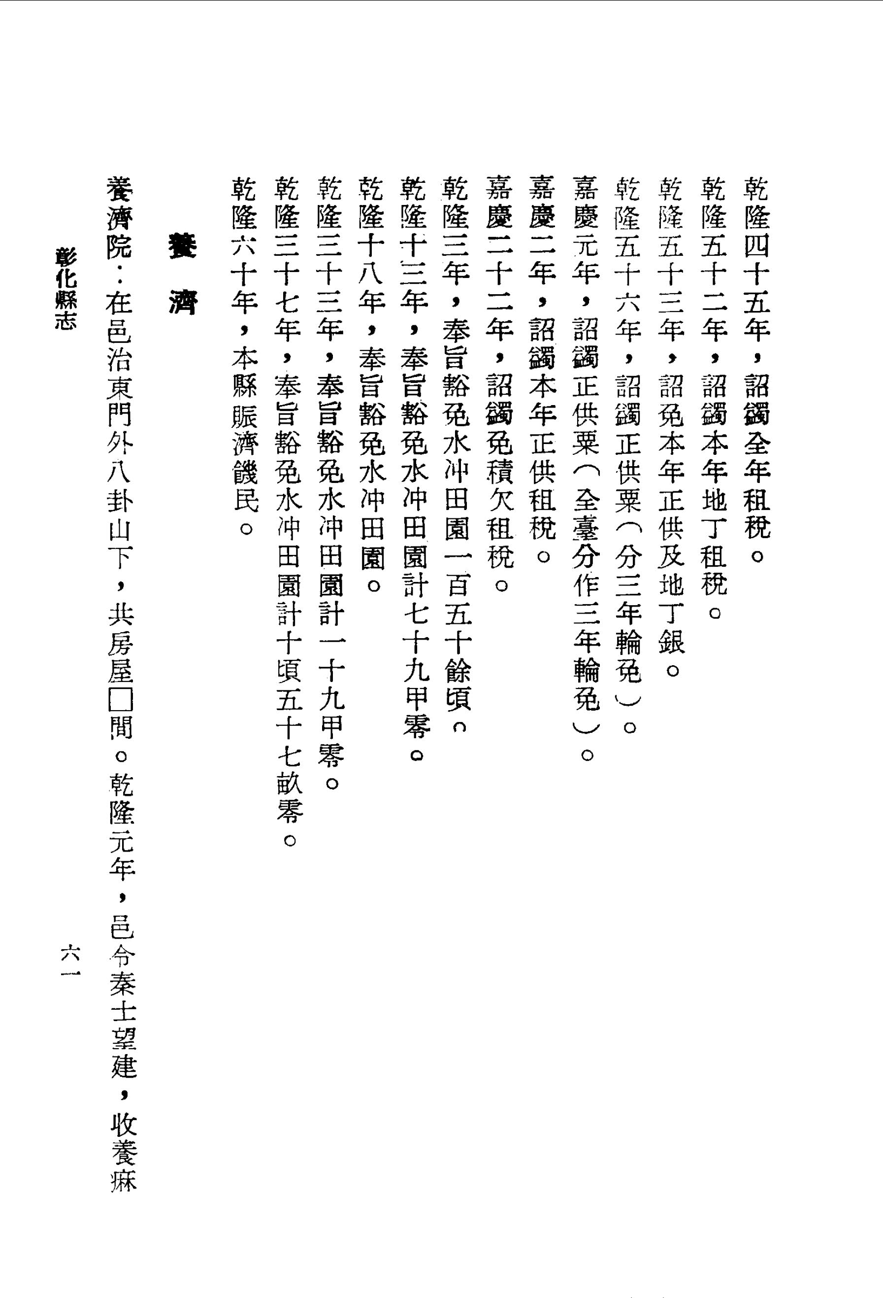 養濟院:在邑治東門外八卦山下,共房屋□間.乾隆元年,邑令秦士望建,收養痳瘋殘疾之人.