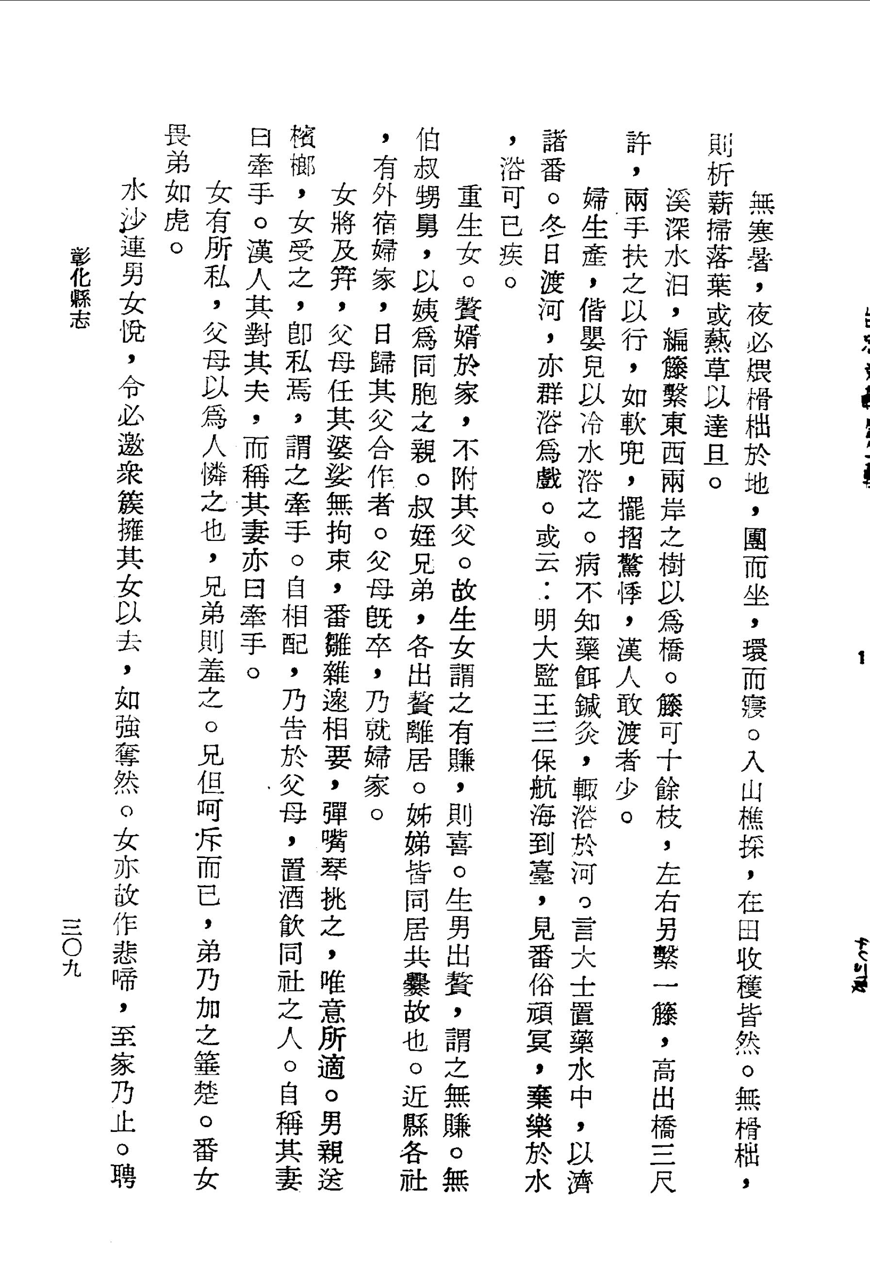 婦生產,偕嬰兒以冷水浴之.病不知藥餌鍼灸,輒浴於河.言大士置藥水中,以濟諸番.冬日渡河,亦群浴為戲.或云:明太監王三保航海到臺,見番俗頑冥,棄藥於水,浴可已疾.