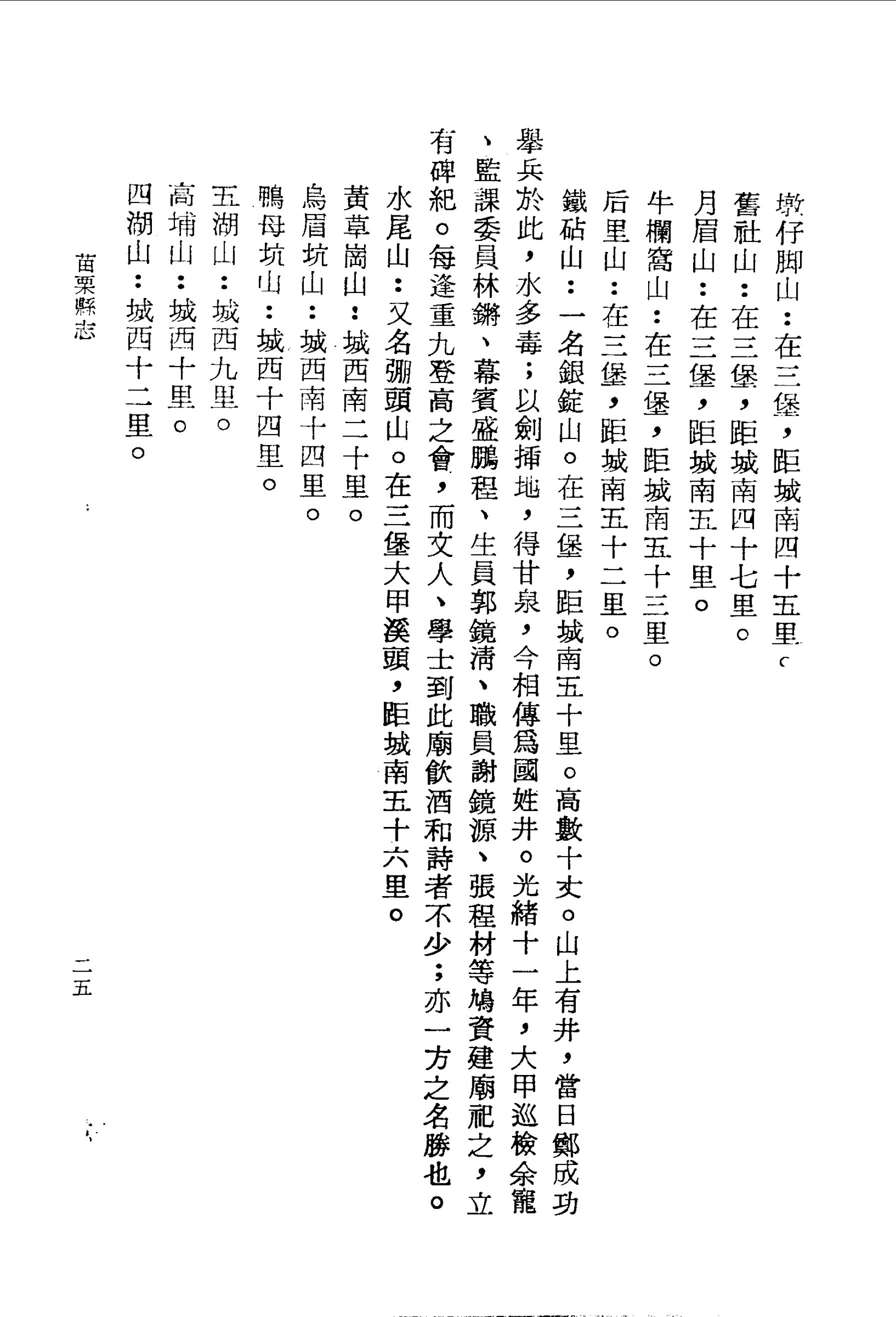 鐵砧山:一名銀錠山.在三堡,距城南五十里.高數十丈.山上有井,當日鄭成功舉兵於此,水多毒;以劍插地,得甘泉,今相傳為國姓井.