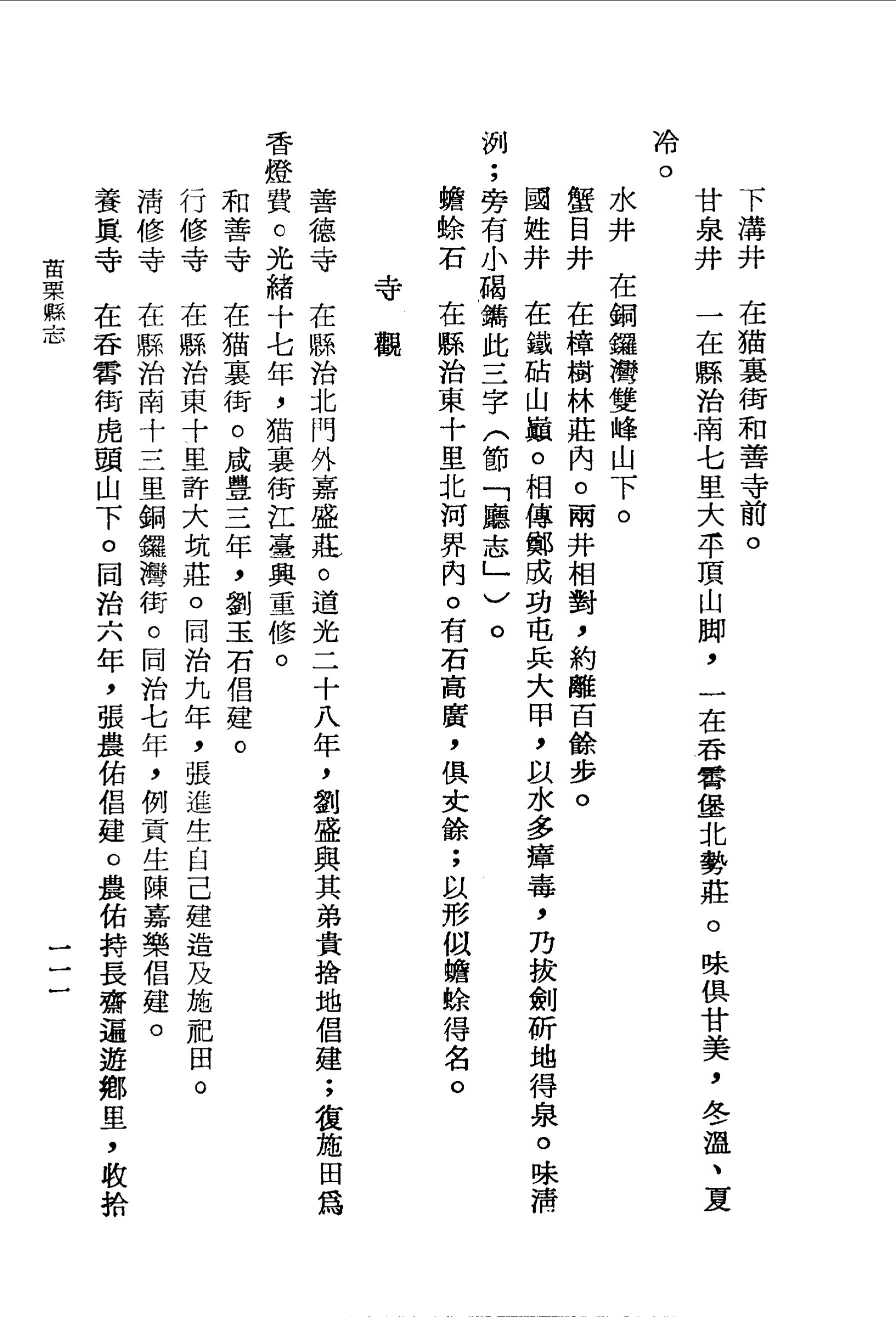 國姓井 在鐵砧山巔.相傳鄭成功屯兵大甲,以水多瘴毒,乃拔劍斫地得泉.味清洌;旁有小碣鐫此三字(節「廳志」).