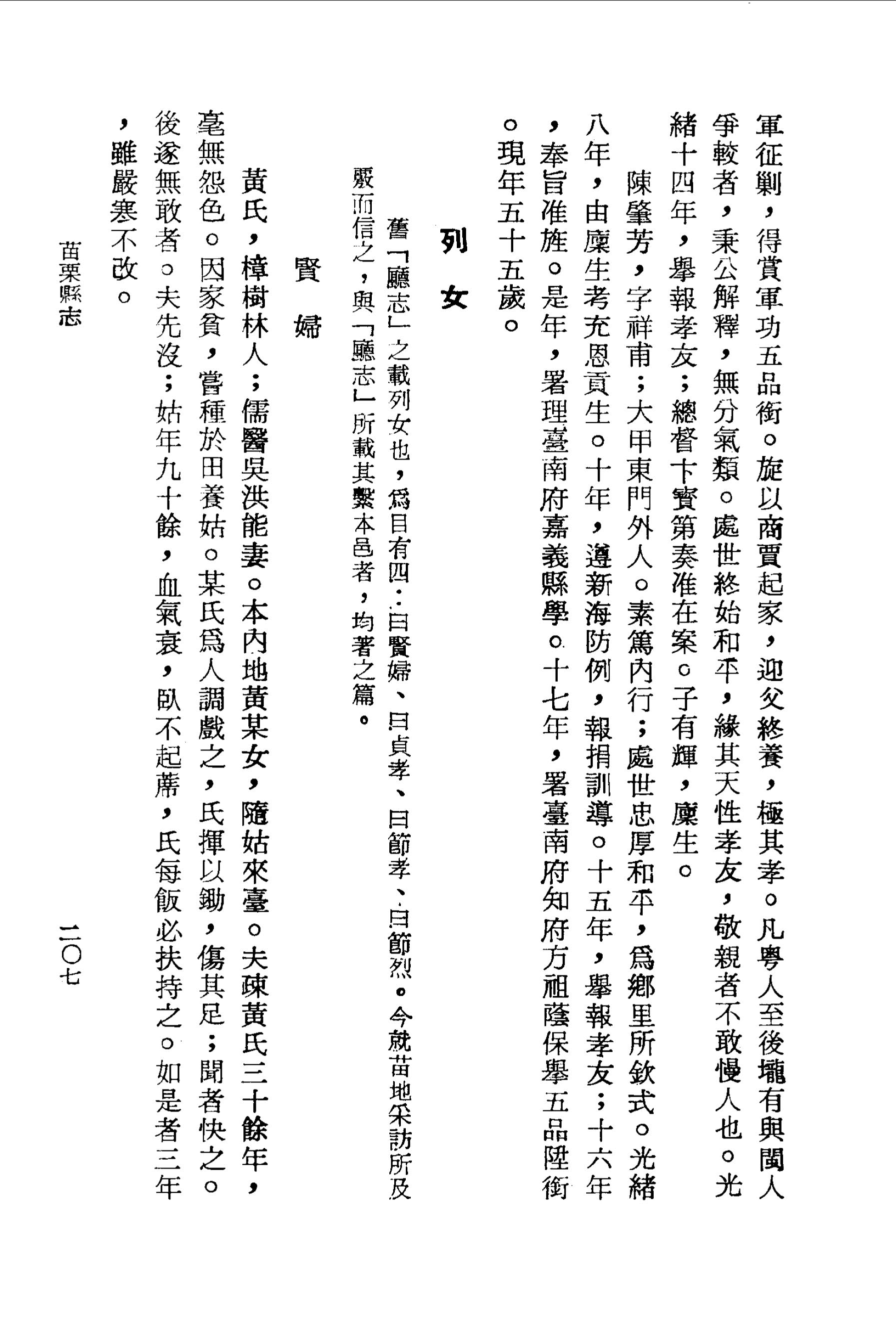 黃氏,樟樹林人;儒醫吳洪能妻.本內地黃某女,隨姑來臺.夫疎黃氏三十餘年,毫無怨色.因家貧,嘗種於田養姑.某氏為人調戲之,氏揮以鋤,傷其足;聞者快之.後遂無敢者.夫先沒;姑年九十餘,血氣衰,臥不起蓆,氏每飯必扶持之.如是者三年,雖嚴寒不改.