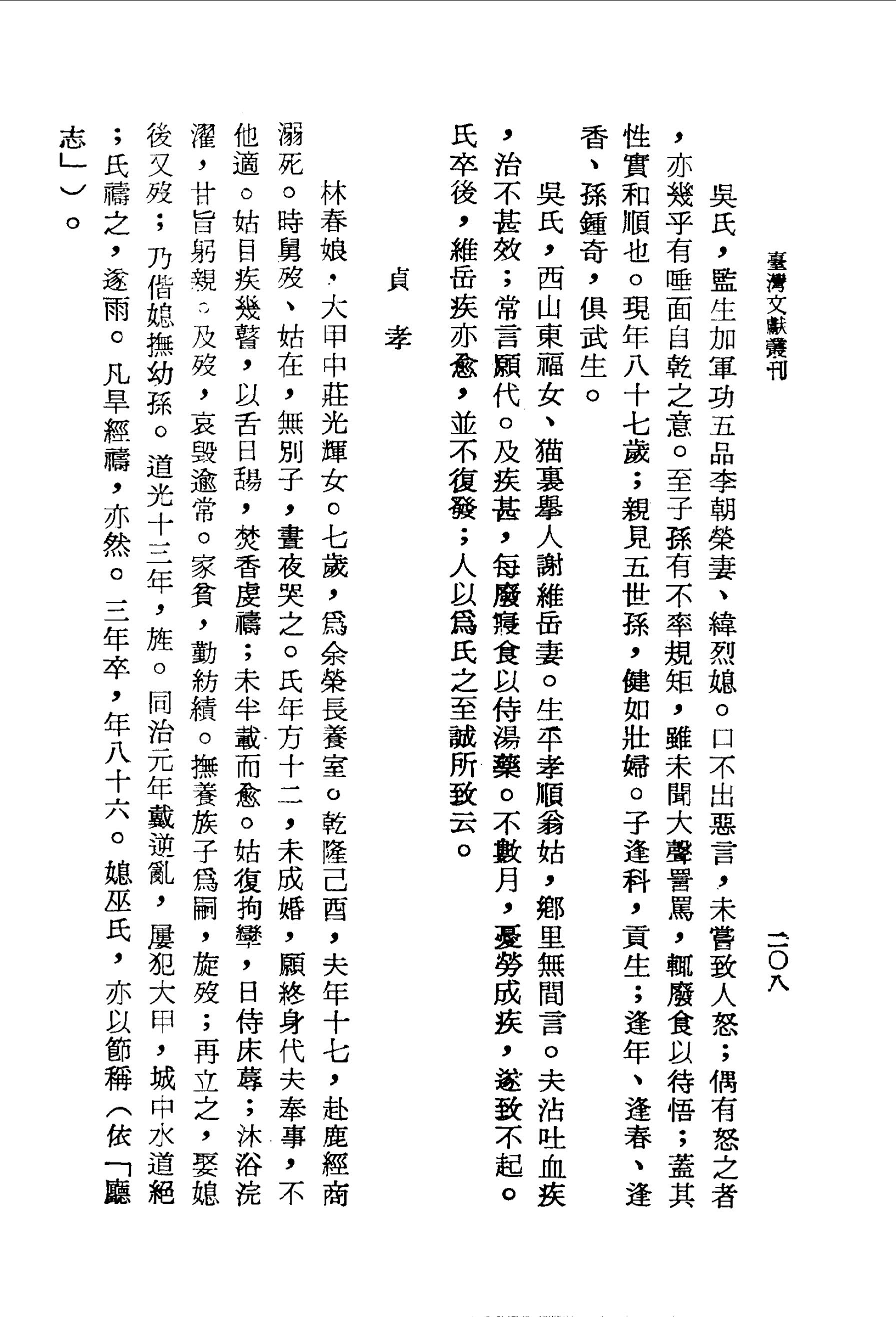 吳氏,西山東福女、貓裏舉人謝維岳妻.生平孝順翁姑,鄉里無間言.夫沾吐血疾,治不甚效;常言願代.及疾甚,每廢寢食以侍湯藥.不數月,憂勞成疾,遂致不起.氏卒後,維岳疾亦愈,並不復發;人以為氏之至誠所致云.