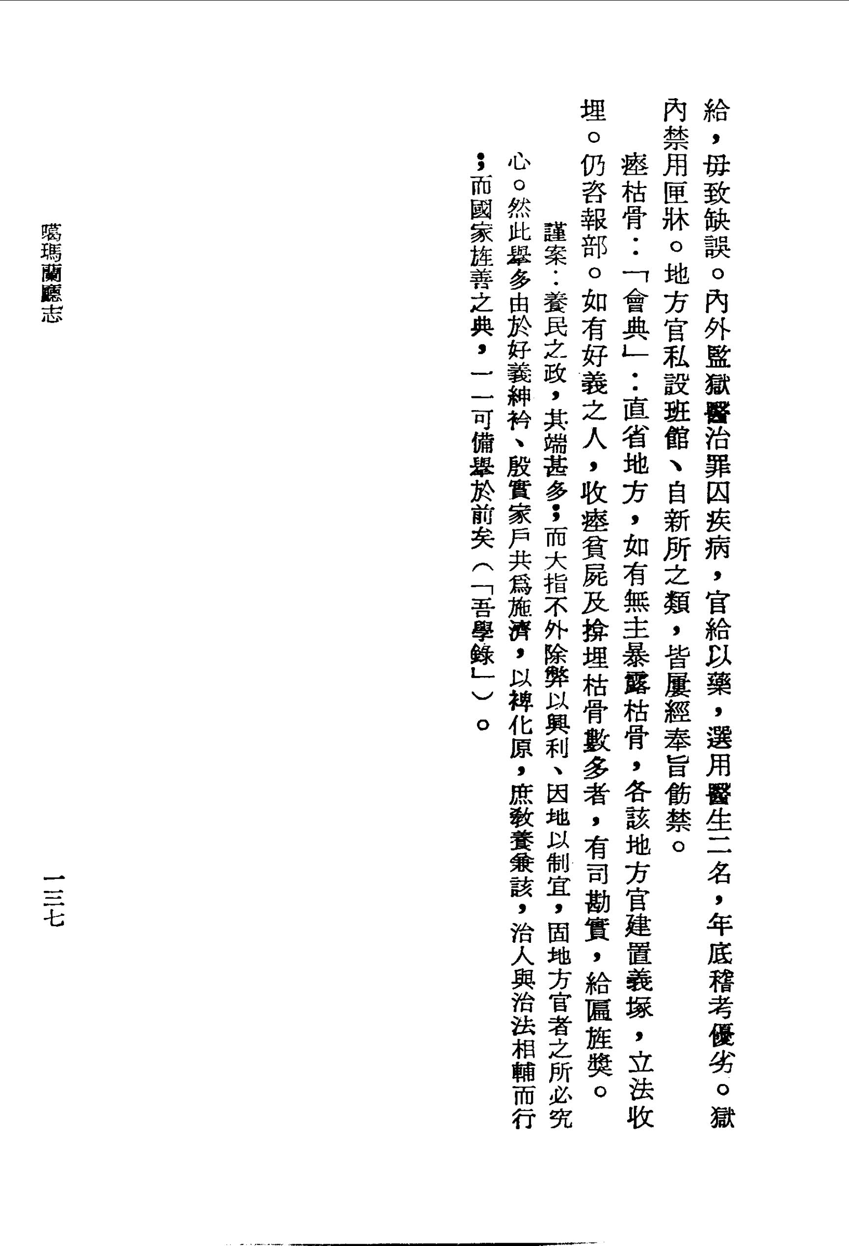 矜囚獄:「會典」:在禁囚犯,日給倉米一升,冬給絮衣一件.鎖杻常須洗滌,席薦常須鋪置.冬設煖床,夏備涼漿,並於本處有司,在官錢糧內施放.獄官預期申明關給,毋致缺誤.內外監獄醫治罪囚疾病,官給以藥,選用醫生二名,年底稽考優劣.獄內禁用匣床.地方官私設班館、自新所之類,皆屢經奉旨飭禁.