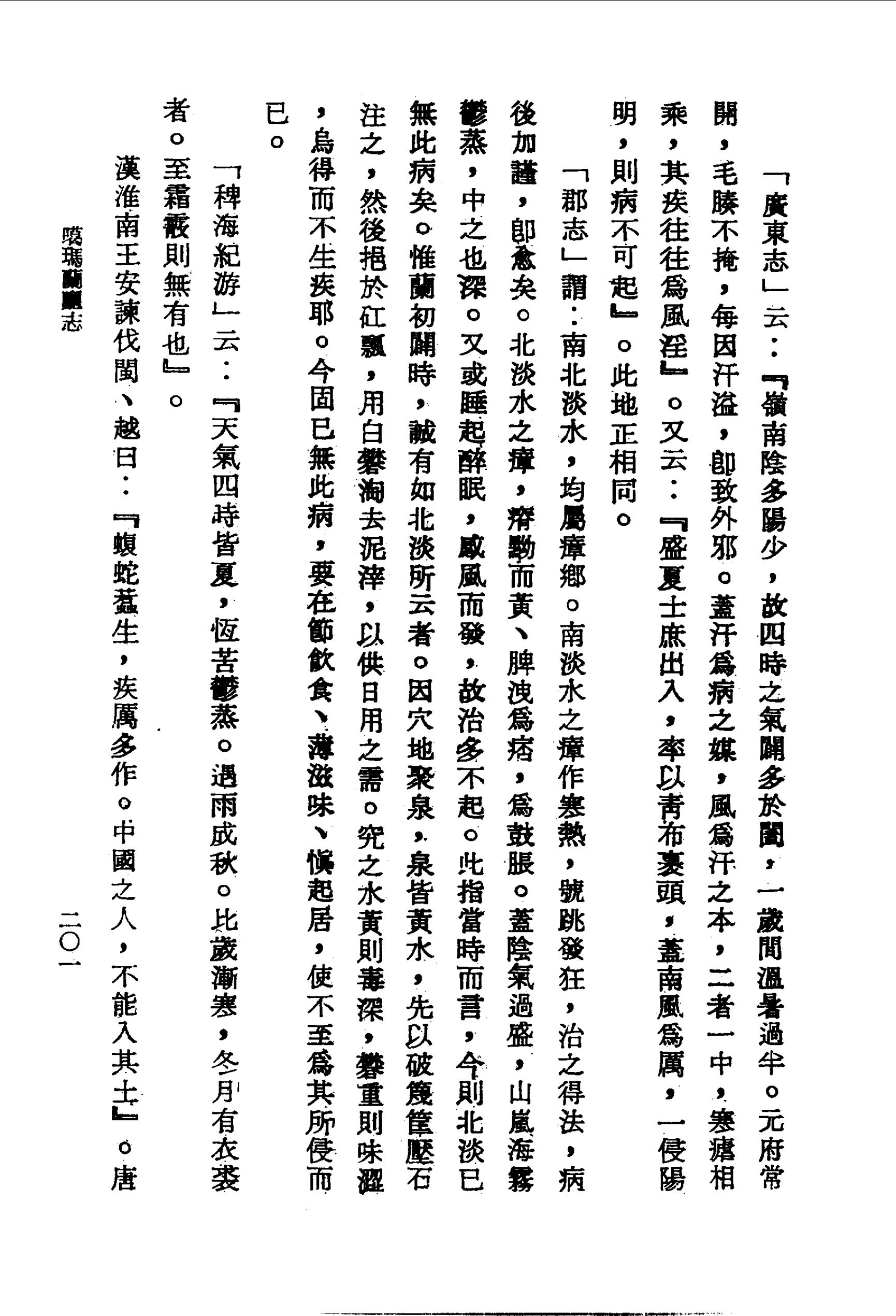 「郡志」謂:南北淡水,均屬瘴鄉.南淡水之瘴作寒熱,號跳發狂,治之得法,病後加謹,即愈矣.北淡水之瘴,瘠黝而黃、脾洩為痞,為鼓脹.蓋陰氣過盛,山嵐海霧鬱蒸,中之也深.又或睡起醉眠,感風而發,故治多不起.此指當時而言,今則北淡已無此病矣.惟蘭初闢時,誠有如北淡所云者.因穴地聚泉,泉皆黃水,先以破篾筐壓石注之,然後挹於矼瓢,用白礬淘去泥滓,以供日用之需.究之水黃則毒深,礬重則味澀,烏得而不生疾耶.今固已無此病,要在節飲食、薄滋味、慎起居,使不至為其所侵而已.
