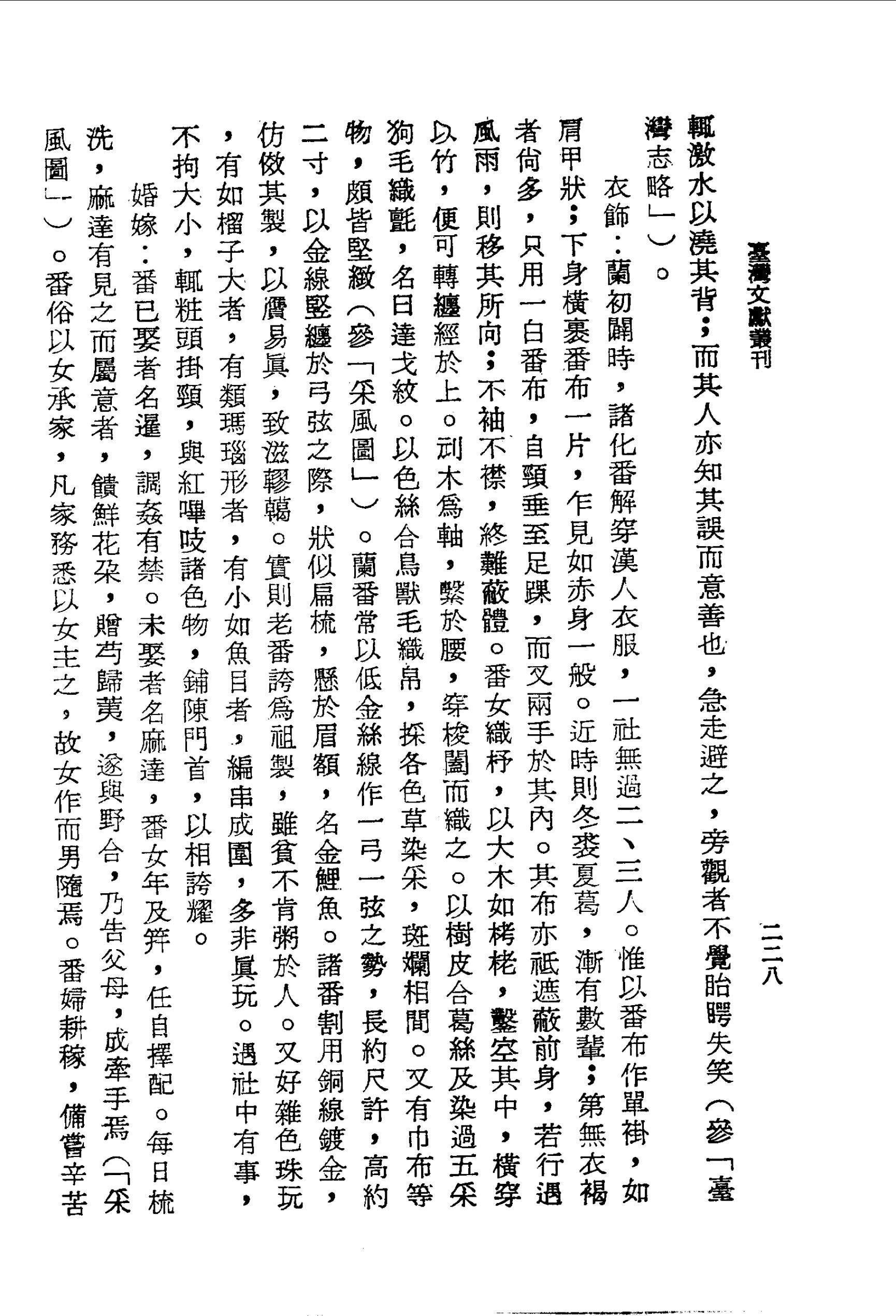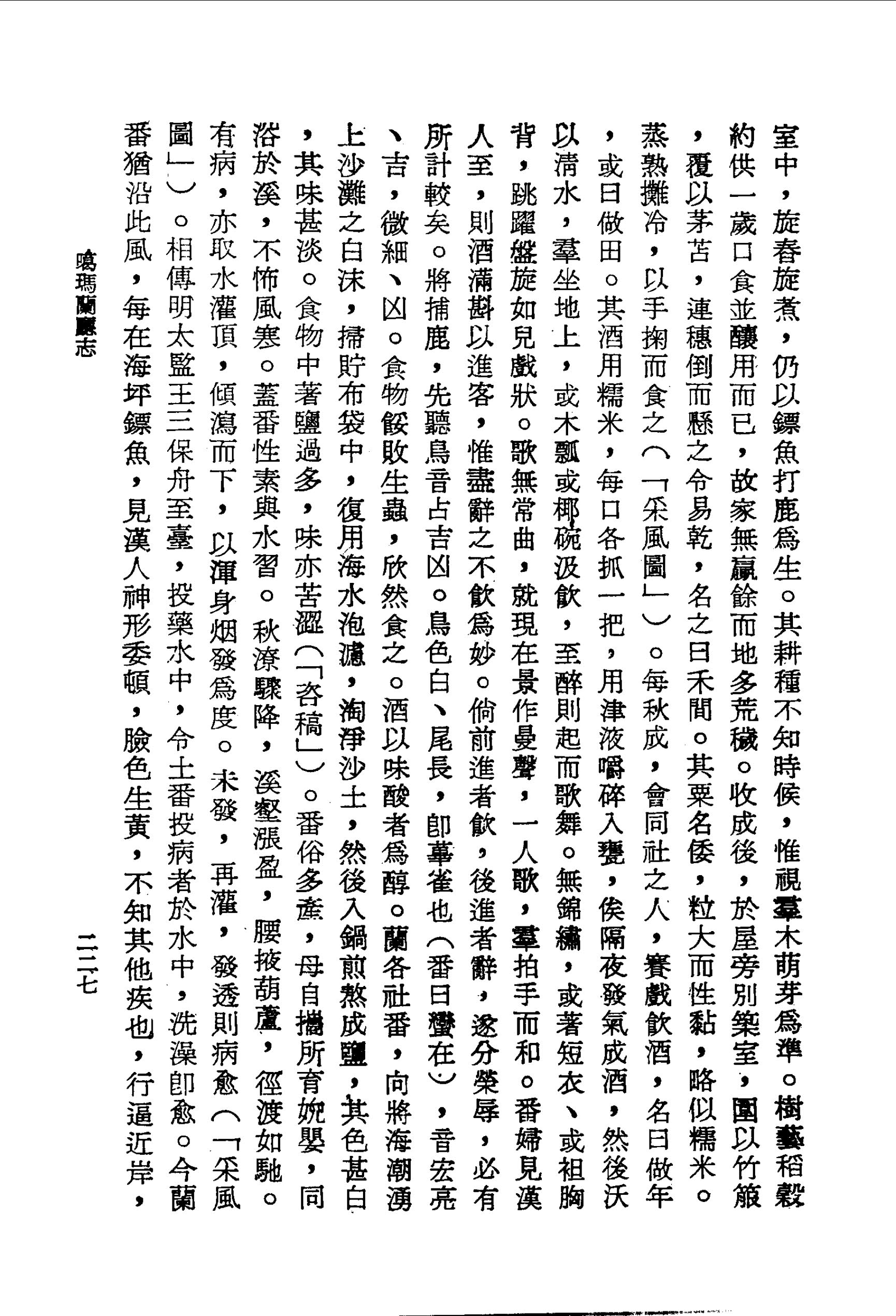 番俗多產,母自攜所育婗嬰,同浴於溪,不怖風寒.蓋番性素與水習.秋潦驟降,溪壑漲盈,腰掖葫蘆,徑渡如馳.有病,亦取水灌頂,傾瀉而下,以渾身烟發為度.未發,再灌,發透則病愈(「采風圖」).相傳明太監王三保舟至臺,投藥水中,令土番投病者於水中,洗澡即愈.今蘭番猶沿此風,每在海坪鏢魚,見漢人神形委頓,臉色生黃,不知其他疾也,行逼近岸,輒激水以澆其背;而其人亦知其誤而意善也,急走避之,旁觀者不覺眙目咢失笑(參「臺灣志略」).