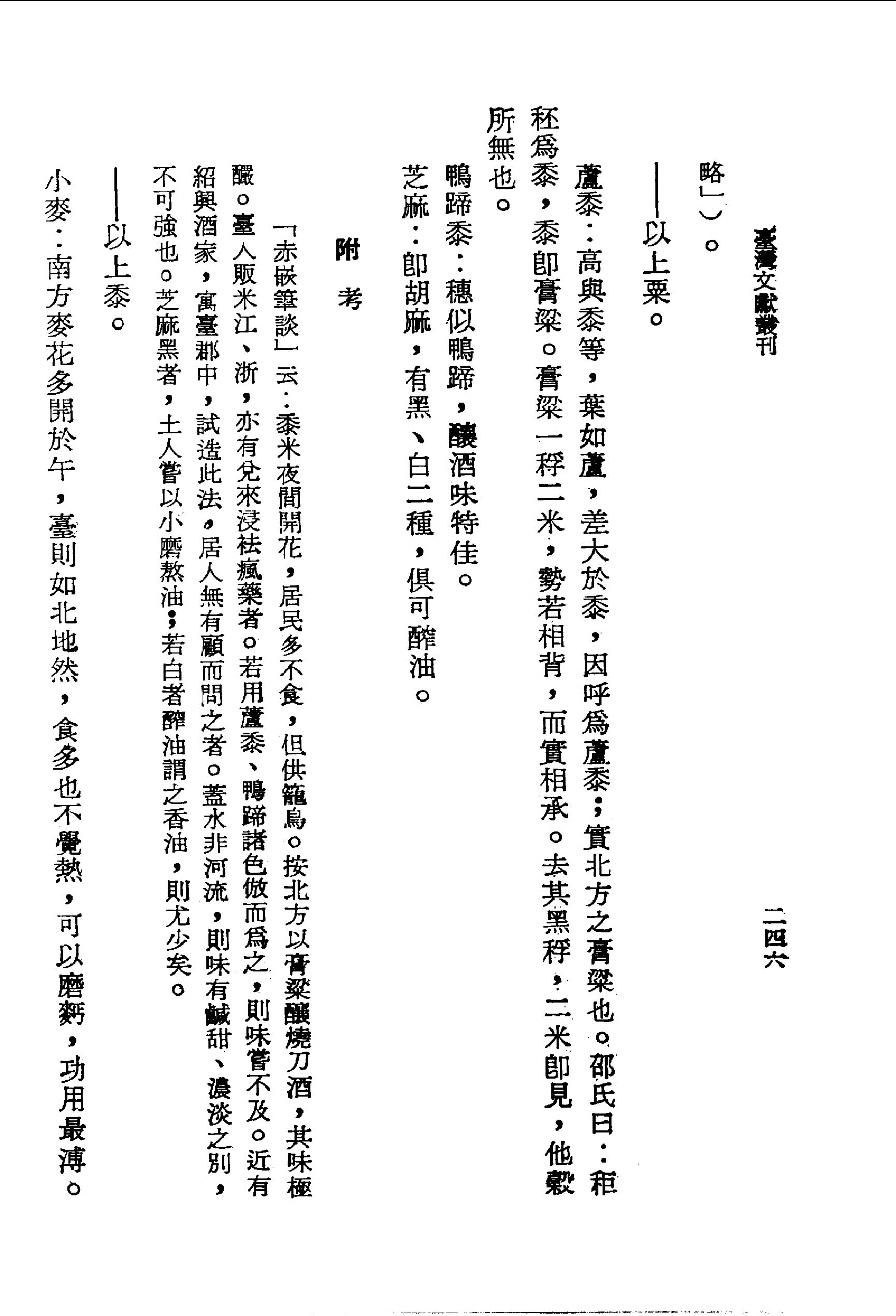 「赤嵌筆談」云:黍米夜間開花,居民多不食,但供籠鳥.按北方以膏粱釀燒刀酒,其味極釅.臺人販米江、浙,亦有兌來浸袪瘋藥者.