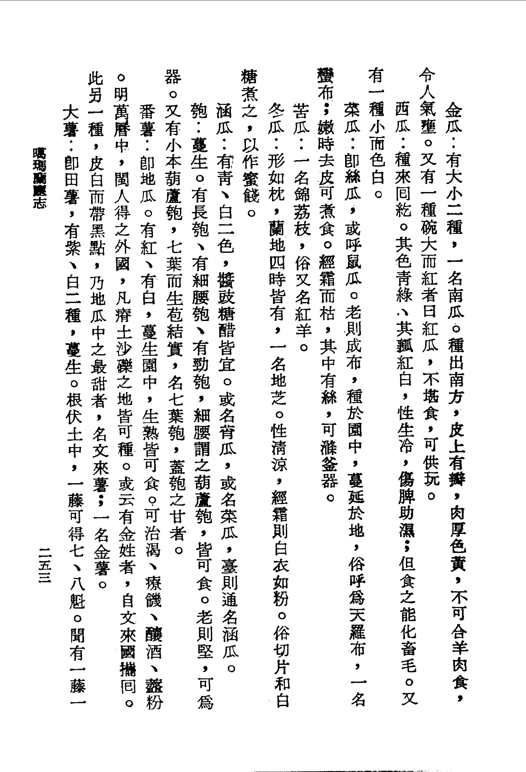 番薯:即地瓜.有紅、有白,蔓生園中,生熟皆可食.可治渴、療饑、釀酒、虀粉.明萬曆中,閩人得之外國,凡瘠土沙礫之地皆可種.或云有金姓者,自文來國攜回.此另一種,皮白而帶黑點,乃地瓜中之最甜者,名文來薯;一名金薯.