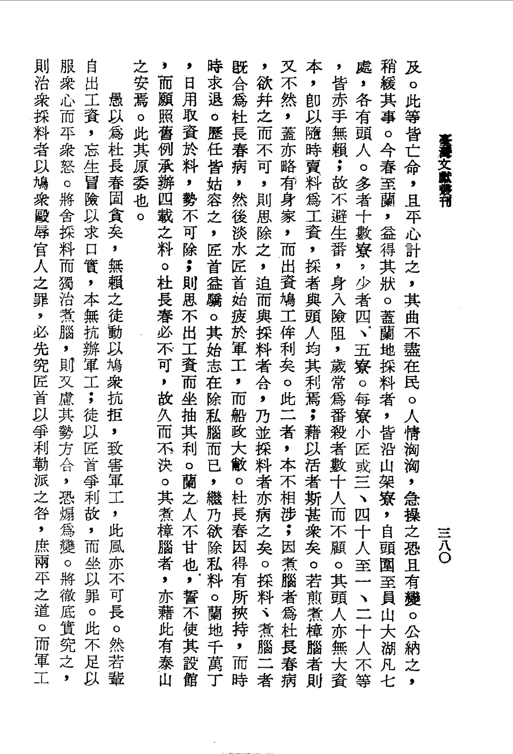 蓋蘭地採料者,皆沿山架寮,自頭圍至員山大湖凡七處,各有頭人.多者十數寮,少者四、五寮.每寮小匠或三、四十人至一、二十人不等,皆赤手無賴;故不避生番,身入險阻,歲常為番殺者數十人而不顧.其頭人亦無大資本,即以隨時賣料為工資,採者與頭人均其利焉;藉以活者斯甚眾矣.若煎煮樟腦者則又不然,蓋亦略有身家,而出資鳩工侔利矣.此二者,本不相涉;因煮腦者為杜長春病,欲并之而不可,則思除之,迫而與採料者合,乃並採料者亦病之矣.