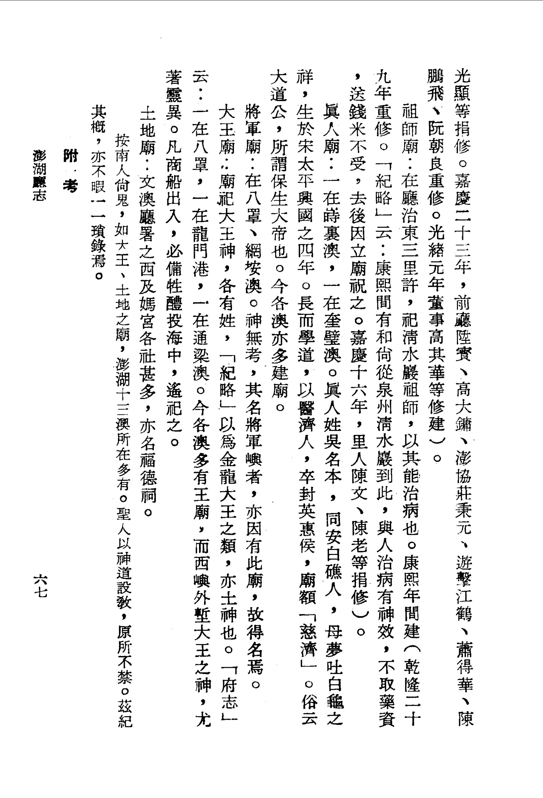 真人廟:一在山時裏澳,一在奎璧澳.真人姓吳名本,同安白礁人,母夢吐白龜之祥,生於宋太平興國之四年.長而學道,以醫濟人,卒封英惠侯,廟額「慈濟」.俗云大道公,所謂保生大帝也.今各澳亦多建廟.