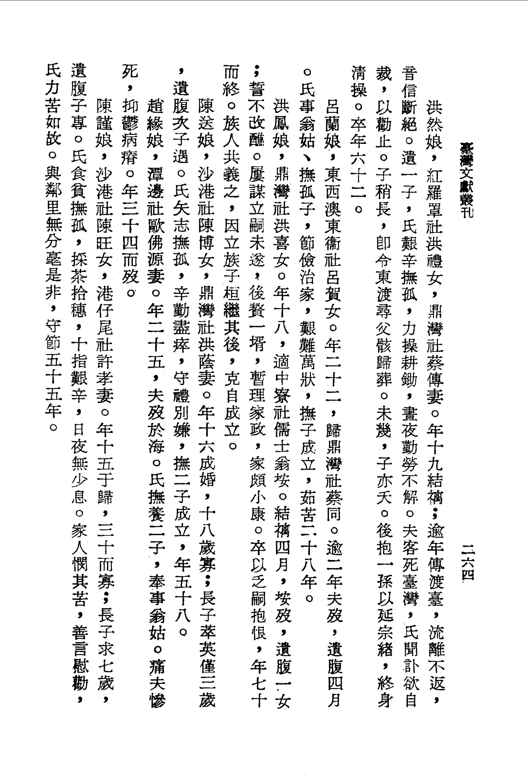 趙緣娘,潭邊社歐佛源妻.年二十五,夫歿於海.氏撫養二子,奉事翁姑.痛夫慘死,抑鬱病瘠.年三十四而歿.