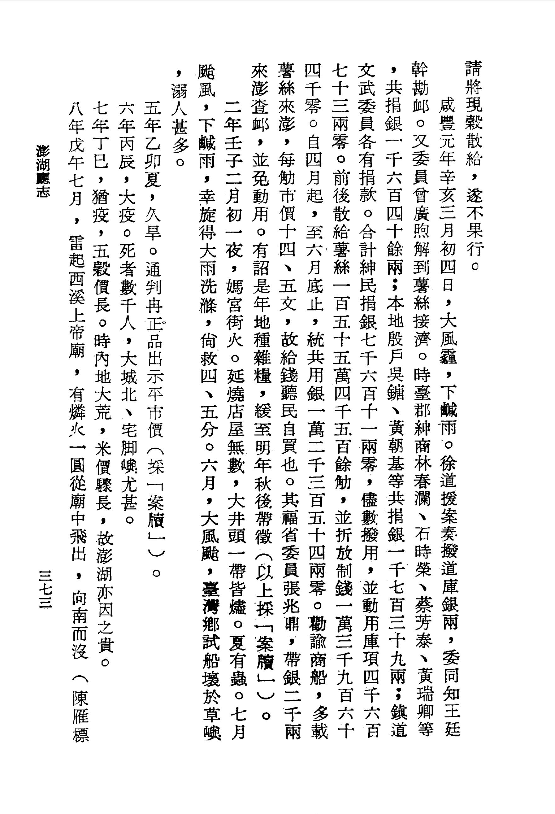 五年乙卯夏,久旱.通判冉正品出示平市價(採「案牘」). 六年丙辰,大疫.死者數千人,大城北、宅腳嶼尤甚. 七年丁巳,猶疫,五穀價長.時內地大荒,米價驟長,故澎湖亦因之貴.