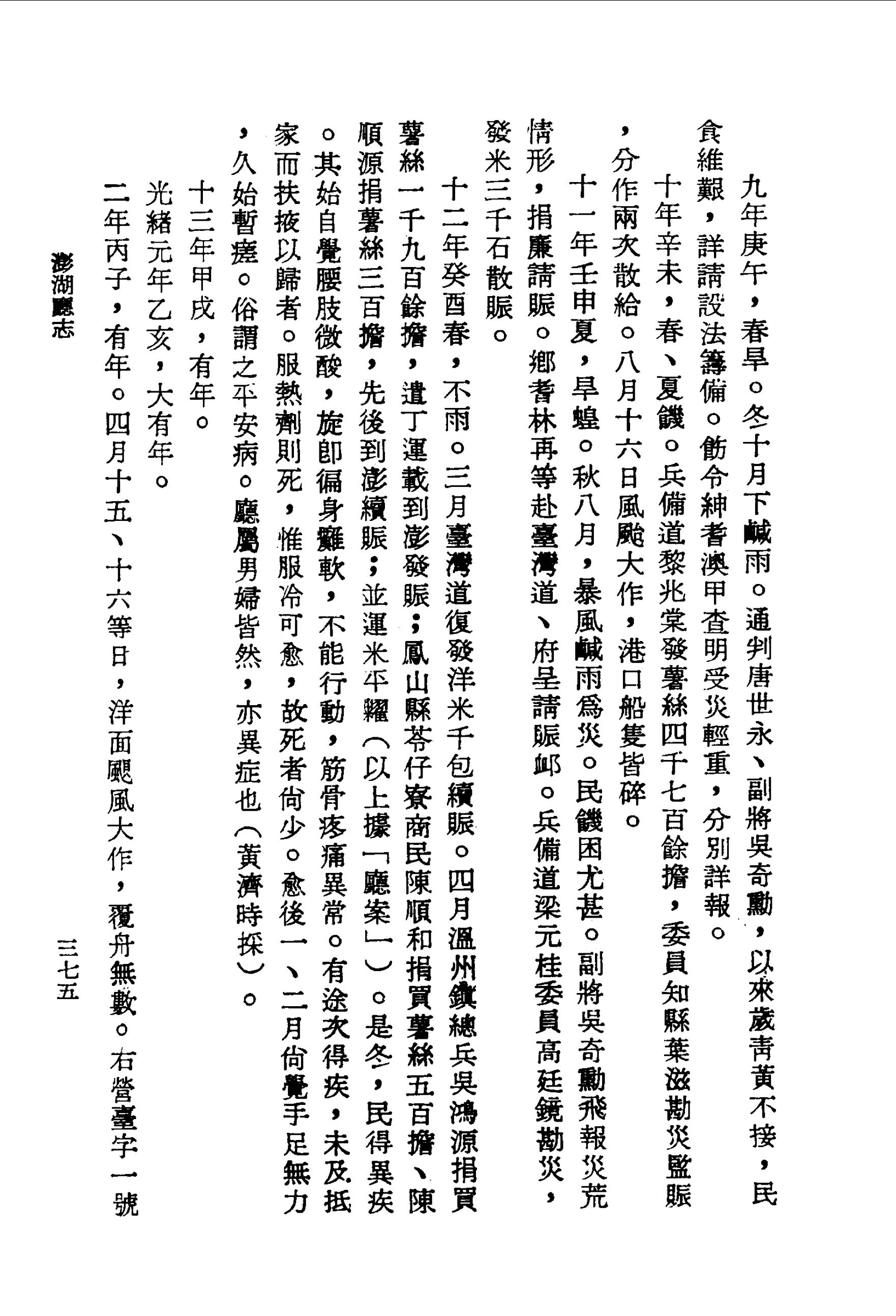 十二年癸酉春,不雨.三月臺灣道復發洋米千包續賑.四月溫州鎮總兵吳鴻源捐買薯絲一千九百餘擔,遣丁運載到澎發賑;鳳山縣苓仔寮商民陳順和捐買薯絲五百擔、陳順源捐薯絲三百擔,先後到澎續賑;並運米平糶(以上據「廳案」).是冬,民得異疾.其始自覺腰肢微酸,旋即遍身癱軟,不能行動,筋骨疼痛異常.有途次得疾,未及抵家而扶掖以歸者.服熱劑則死,惟服冷可愈,故死者尚少.愈後一、二月尚覺手足無力,久始暫瘥.俗謂之平安病.廳屬男婦皆然,亦異症也(黃濟時採).