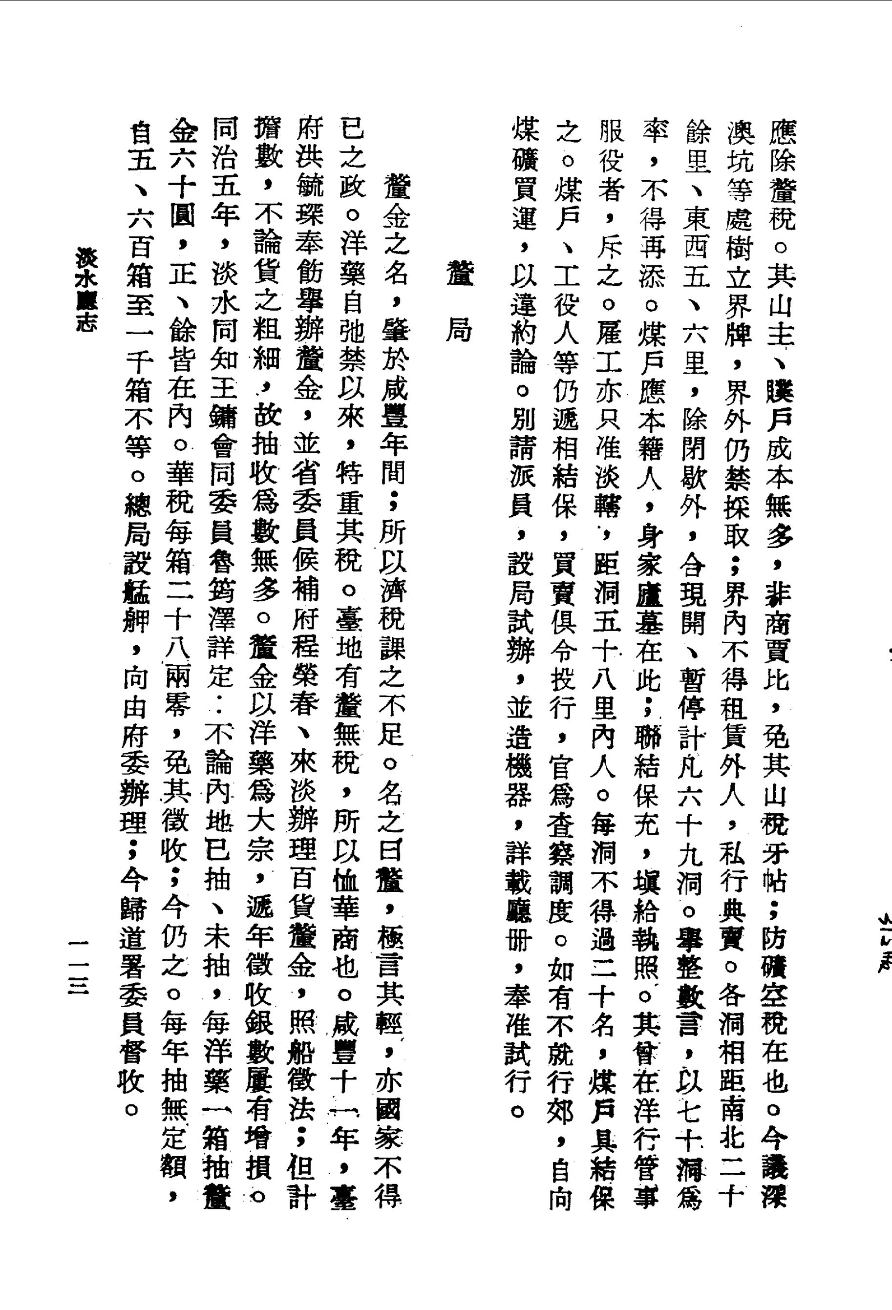 釐金以洋藥為大宗,遞年徵收銀數屢有增損.同治五年,淡水同知王鏞會同委員魯筠澤詳定:不論內地已抽、未抽,每洋藥一箱抽釐金六十圓,正、餘皆在內.華稅每箱二十八兩零,免其徵收;今仍之.每年抽無定額,自五、六百箱至一千箱不等.