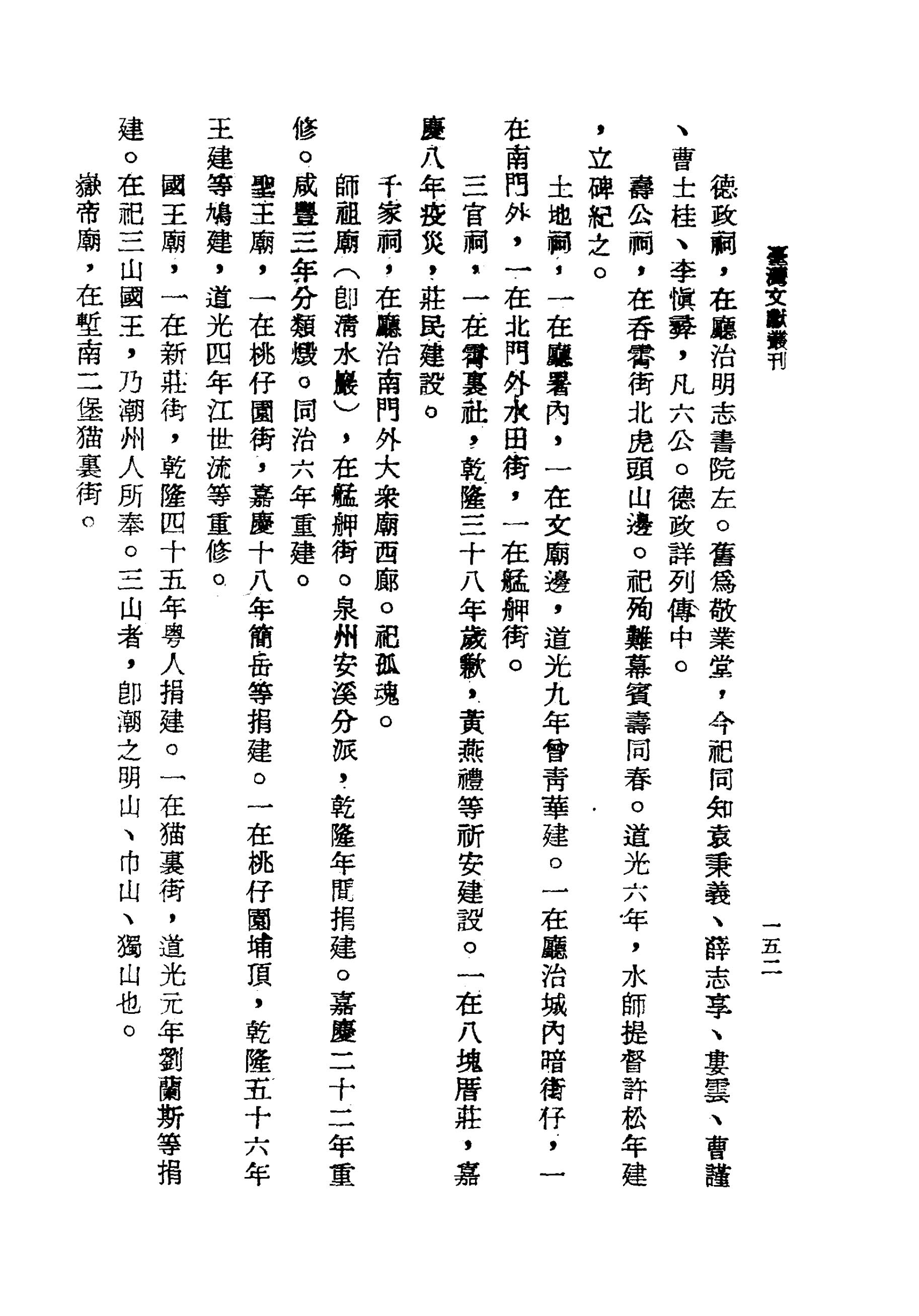 三官祠,一在霄裏社,乾隆三十八年歲歉,黃燕禮等祈安建設.一在八塊厝莊,嘉慶八年疫災,莊民建設.