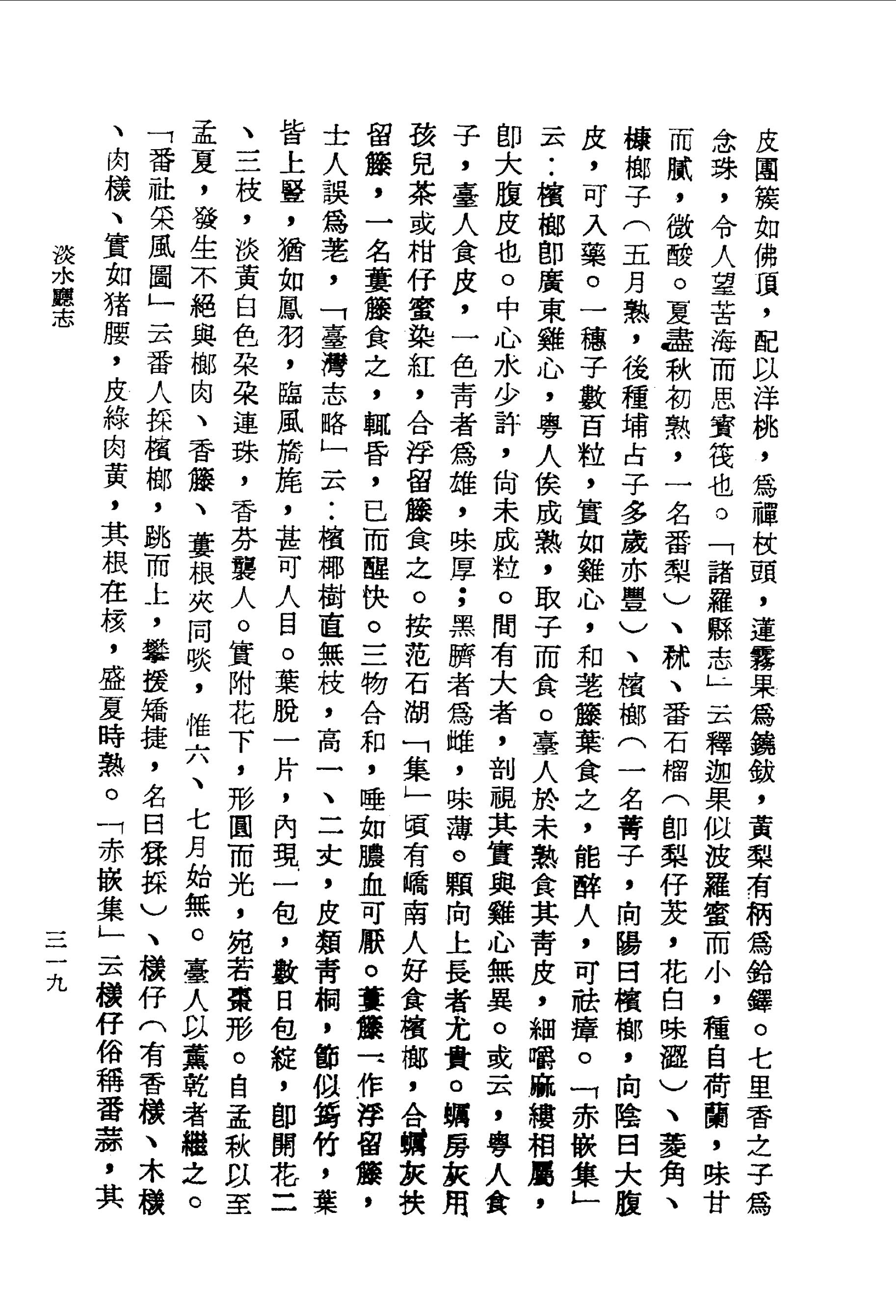 檳榔(一名菁子,向陽曰檳榔,向陰曰大腹皮,可入藥.一穗子數百粒,實如雞心,和荖籐葉食之,能醉人,可祛瘴.「赤嵌集」云:檳榔即廣東雞心,粵人俟成熟,取子而食.臺人於未熟食其青皮,細嚼麻縷相屬,即大腹皮也.中心水少許,尚未成粒.間有大者,剖視其實與雞心無異.或云,粵人食子,臺人食皮,一色青者為雄,味厚;黑臍者為雌,味薄.顆向上長者尤貴.蠣房灰用孩兒茶或柑仔蜜染紅,合浮留籐食之.按范石湖「集」頃有嶠南人好食檳榔,合蠣灰扶留籐,一名蔞籐食之,輒昏,已而醒快.三物合和,唾如膿血可厭.
