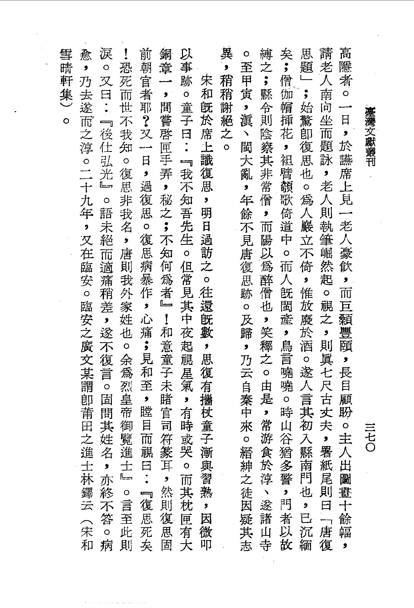 又一日,過復思.復思病暴作,心痛;見和至,瞠目而視曰:『復思死矣!恐死而世不我知.復思非我名,唐則我外家姓也.余為烈皇帝御覽進士』.言至此則淚.又曰:『後仕弘光』.語未絕而適痛稍差,遂不復言.固問其姓名,亦終不答.病愈,乃去遂而之淳.