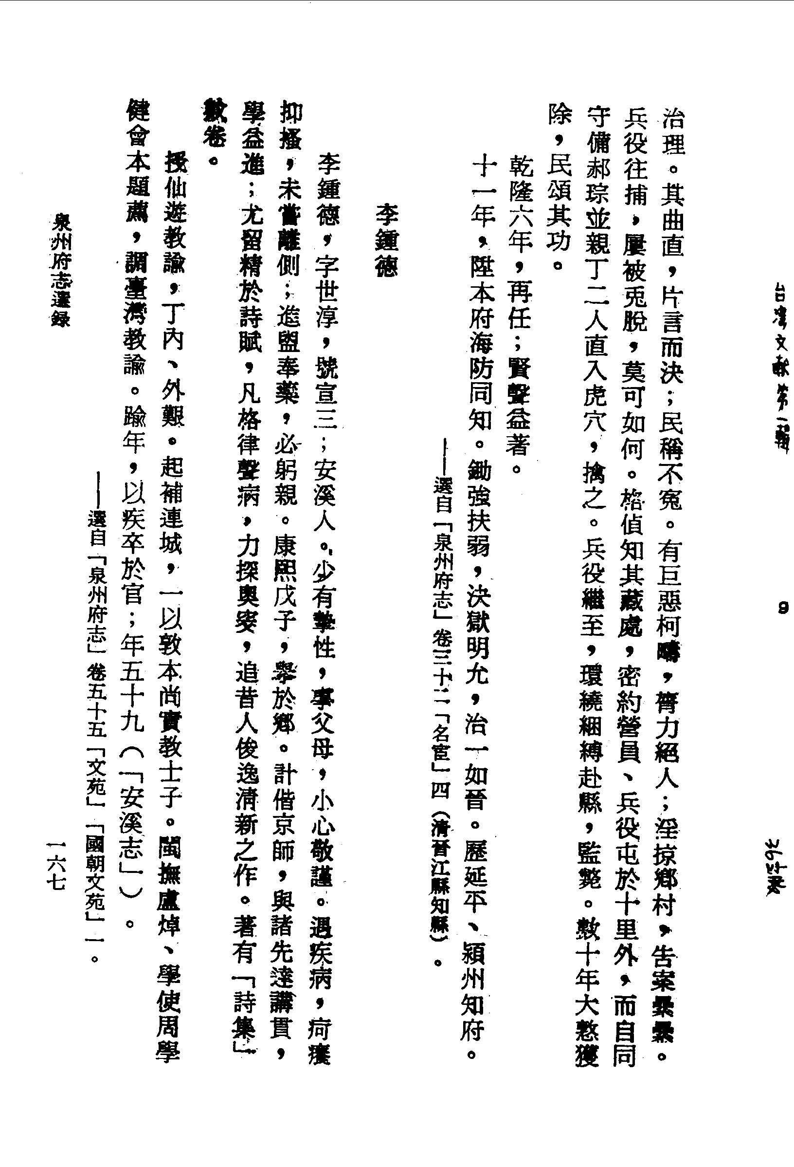 李鍾德,字世淳,號宣三;安溪人.少有摯性,事父母,小心敬謹.遇疾病,疴癢抑搔,未嘗離側;進盥奉藥,必躬親.