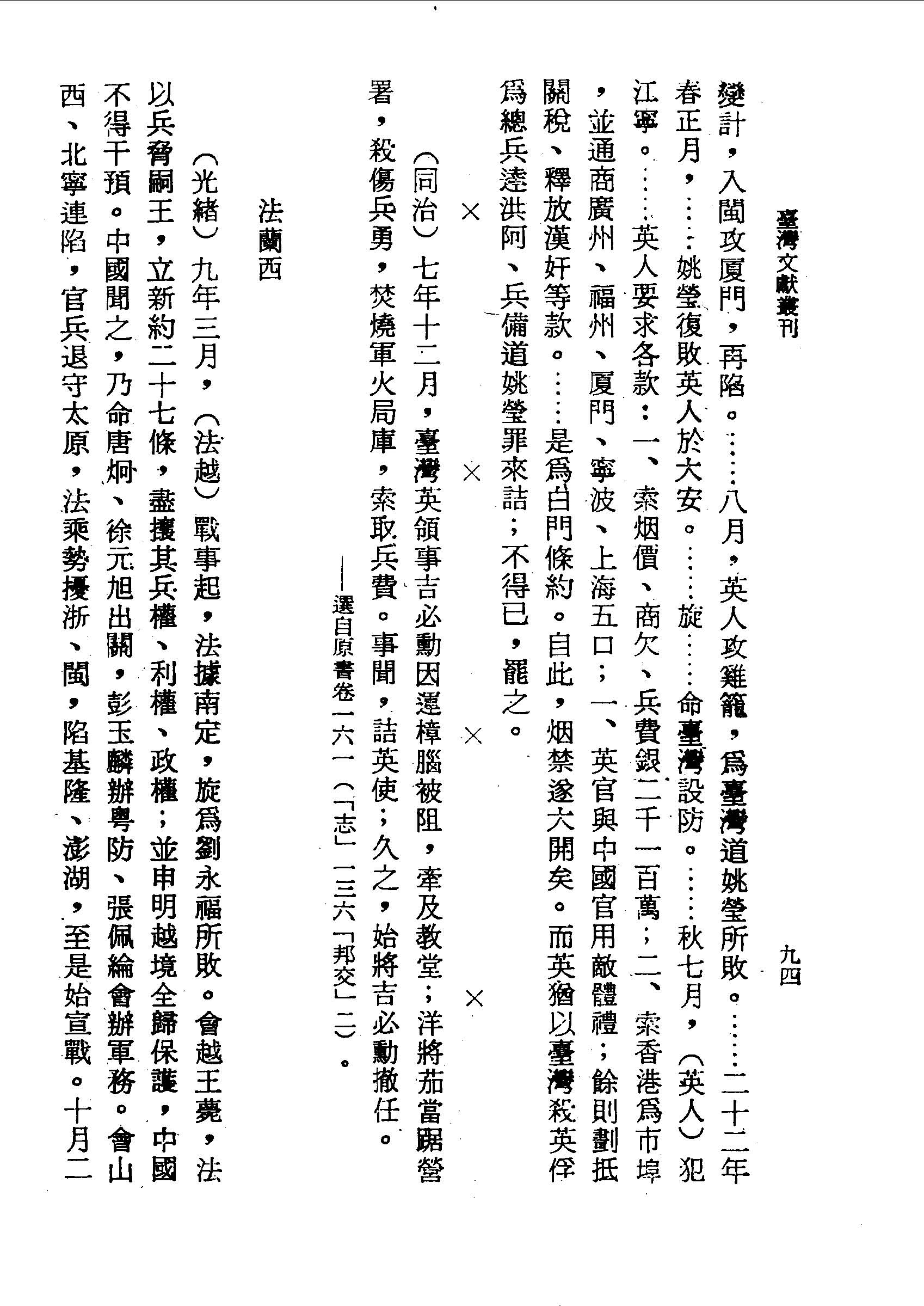 (同治)七年十二月,臺灣英領事吉必勳因運樟腦被阻,牽及教堂;洋將茄當踞營署,殺傷兵勇,焚燒軍火局庫,索取兵費.事聞,詰英使;久之,始將吉必勳撤任. ──選自原書卷一六一(「志」一三六「邦交」二).