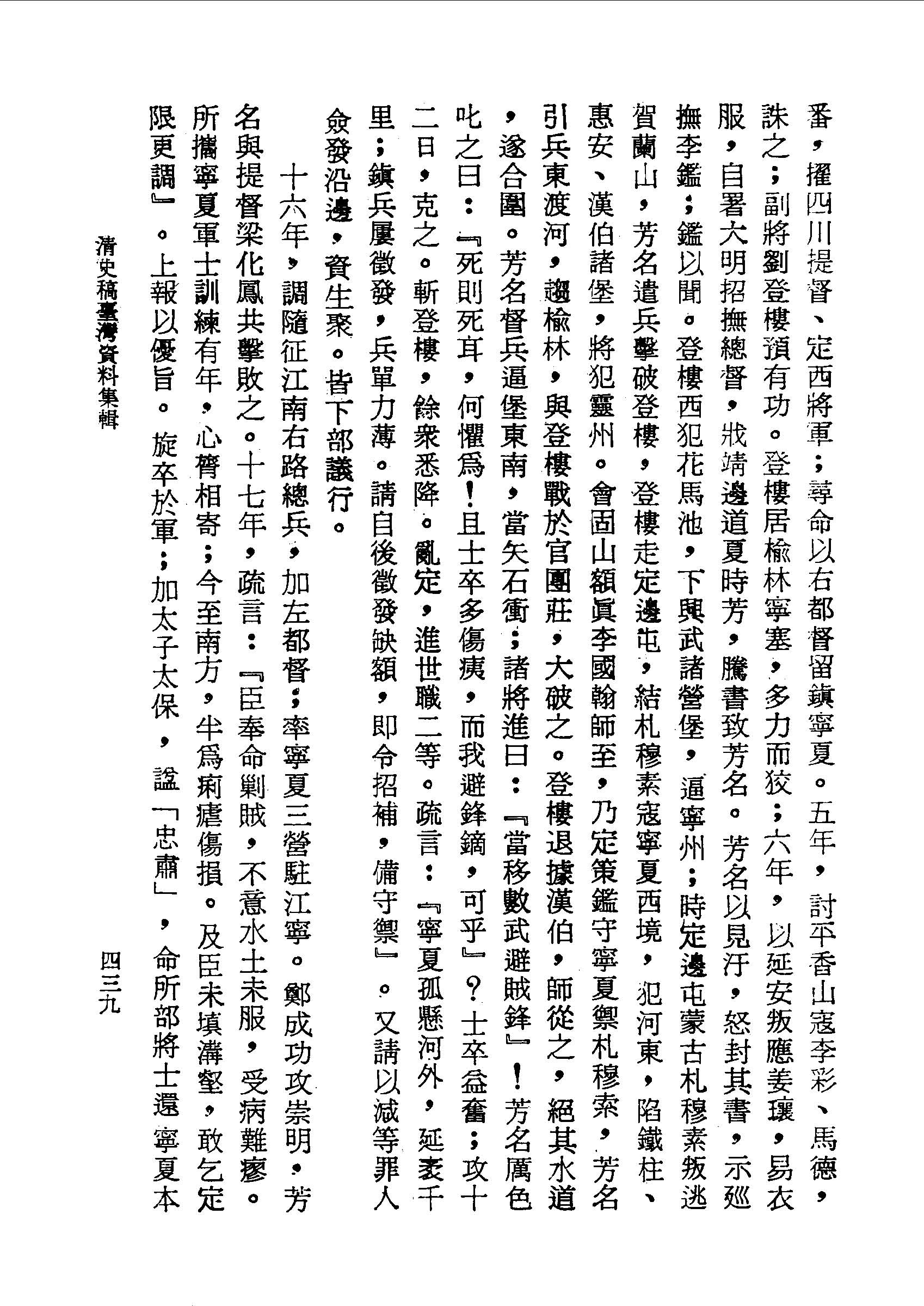 鄭成功攻崇明,芳名與提督梁化鳳共擊敗之.十七年,疏言:『臣奉命勦賊,不意水土未服,受病難瘳.所攜寧夏軍士訓練有年,心膂相寄;今至南方,半為痢瘧傷損.及臣未填溝壑,敢乞定限更調』.
