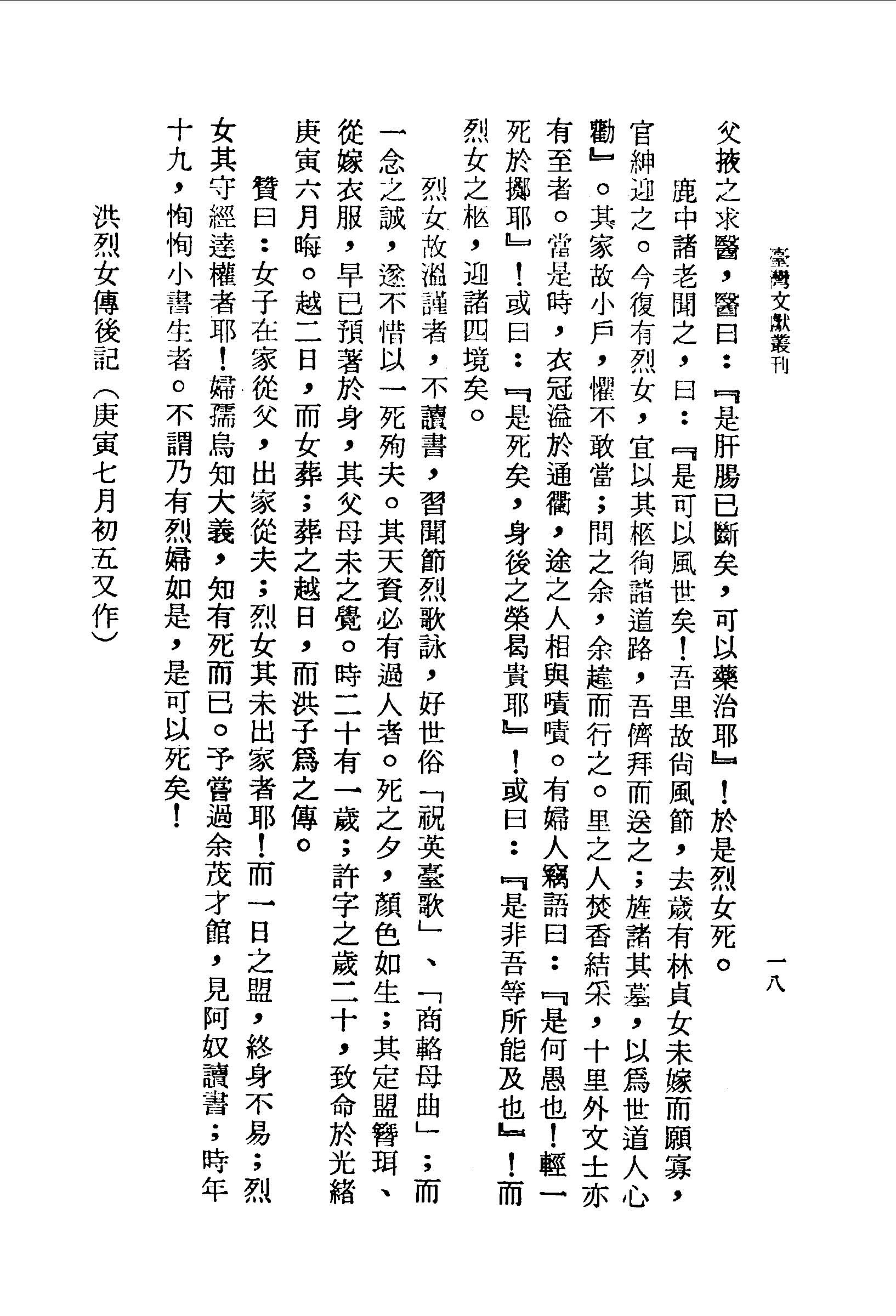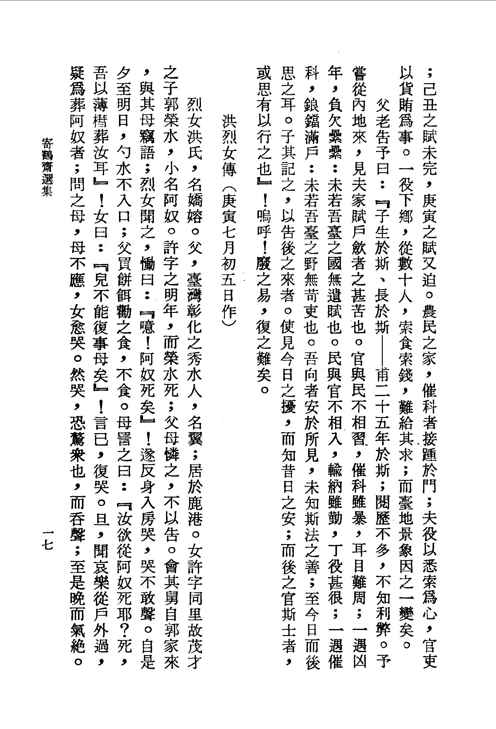 旦,聞哀樂從戶外過,疑為葬阿奴者;問之母,母不應,女愈哭。然哭,恐驚眾也,而吞聲;至是晚而氣絕。父掖之求醫,醫曰:『是肝腸已斷矣,可以藥治耶』!於是烈女死。