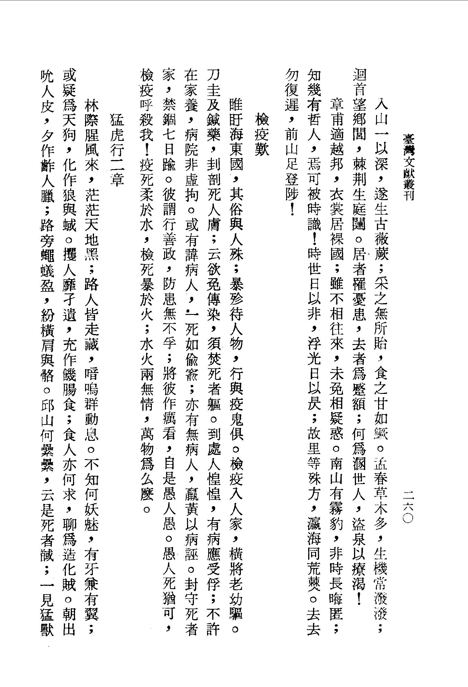 睢盱海東國,其俗與人殊;暴殄待人物,行與疫鬼俱。檢疫入人家,橫將老幼驅。刀圭及鍼藥,刲剖死人膚;云欲免傳染,須焚死者軀。到處人惶惶,有病應受俘;不許在家養,病院非虛拘。或有諱病人,一死如偷窬;亦有無病人,羸黃以病誣。封守死者家,禁錮七日踰。彼謂行善政,防患無不孚;將彼作癘看,自是愚人愚。愚人死猶可,檢疫呼殺我!疫死柔於水,檢死暴於火;水火兩無情,萬物為么麼。