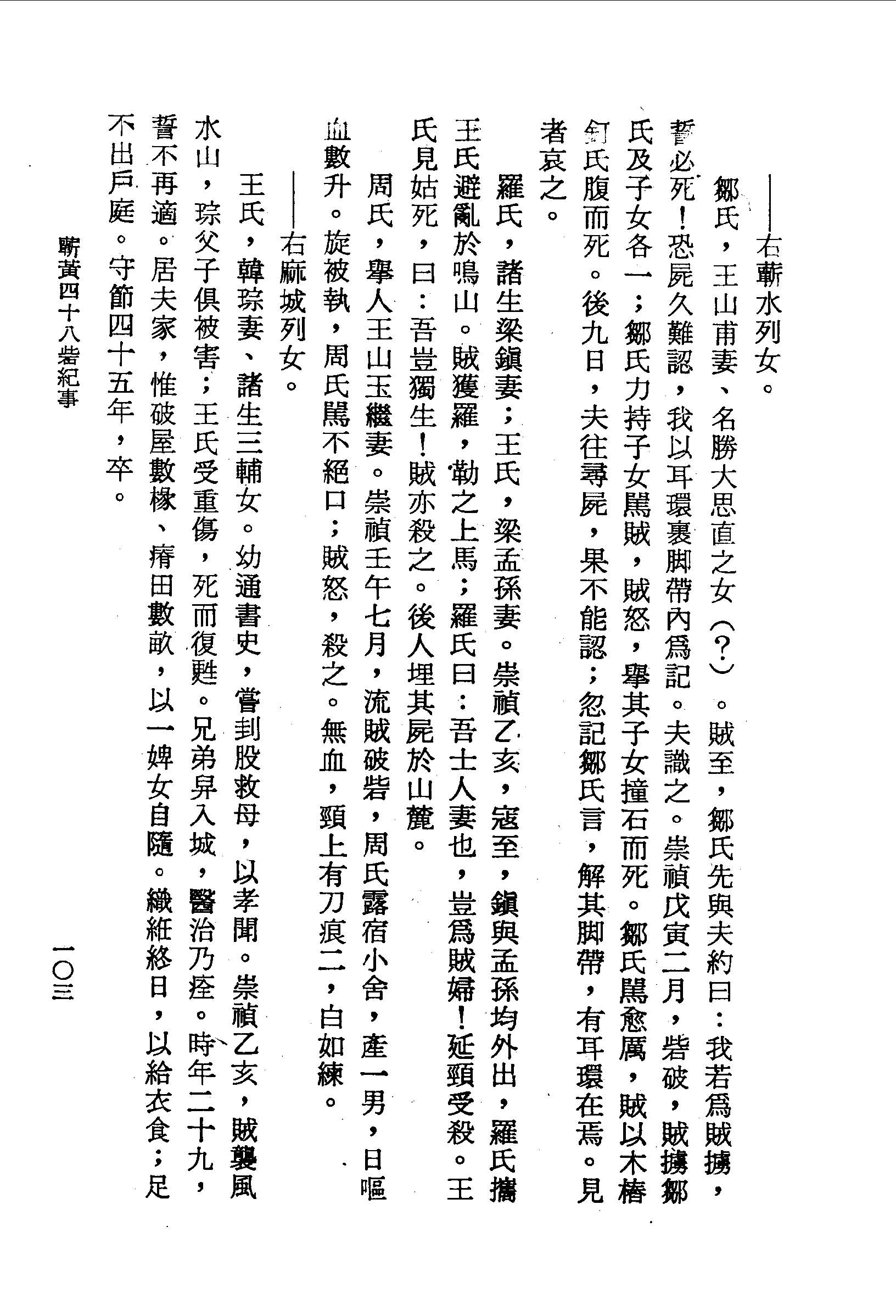 周氏,舉人王山玉繼妻。崇禎壬午七月,流賊破砦,周氏露宿小舍,產一男,日嘔血數升。旋被執,周氏罵不絕口;賊怒,殺之。無血,頸上有刀痕二,白如練。