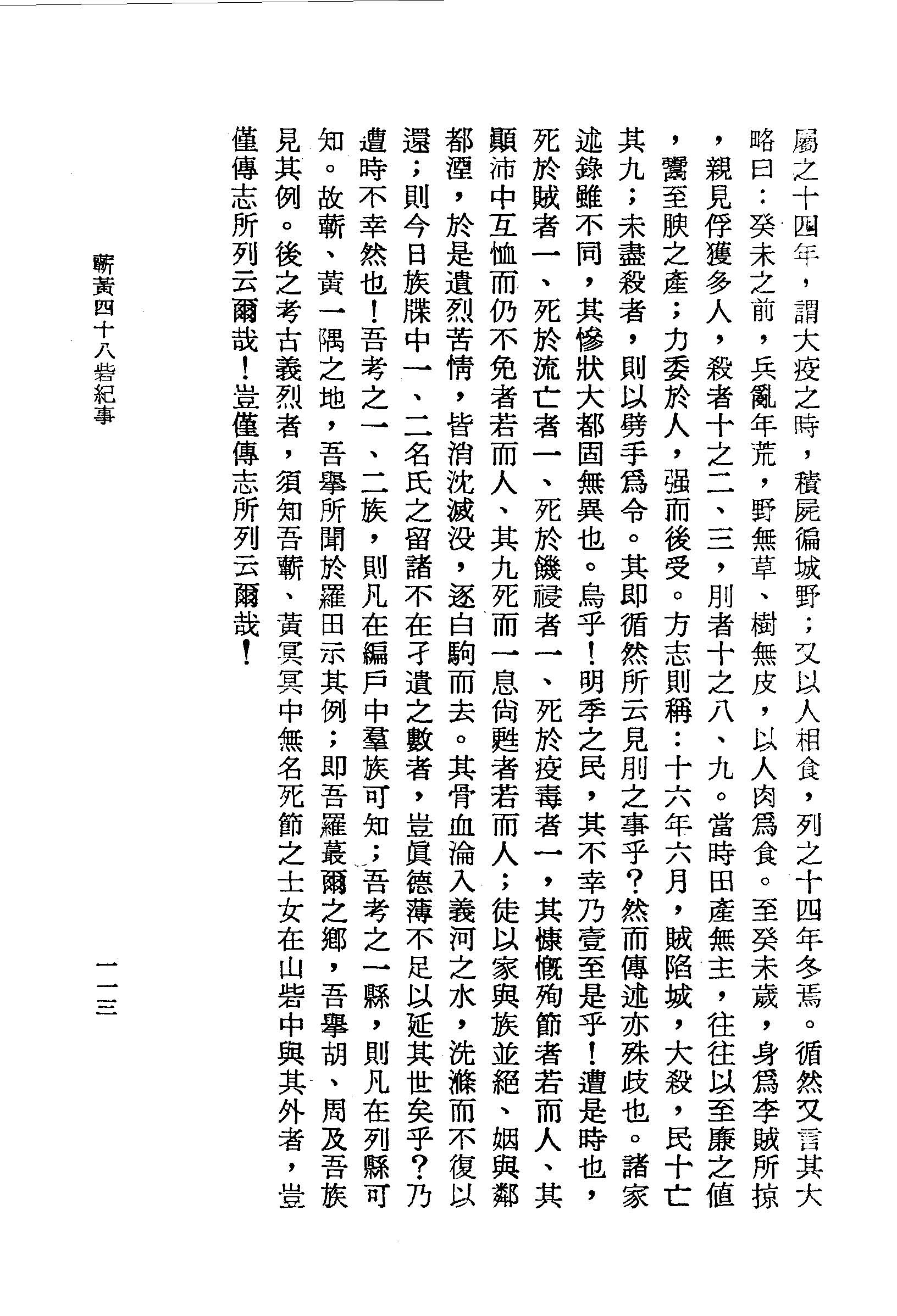 烏乎!明季之民,其不幸乃壹至是乎!遭是時也,死於賊者一、死於流亡者一、死於饑祲者一、死於疫毒者一,其慷慨殉節者若而人、其顛沛中互恤而仍不免者若而人、其九死而一息尚甦者若而人;徒以家與族並絕、姻與鄰都湮,於是遺烈苦情,皆消沈滅沒,逐白駒而去。
