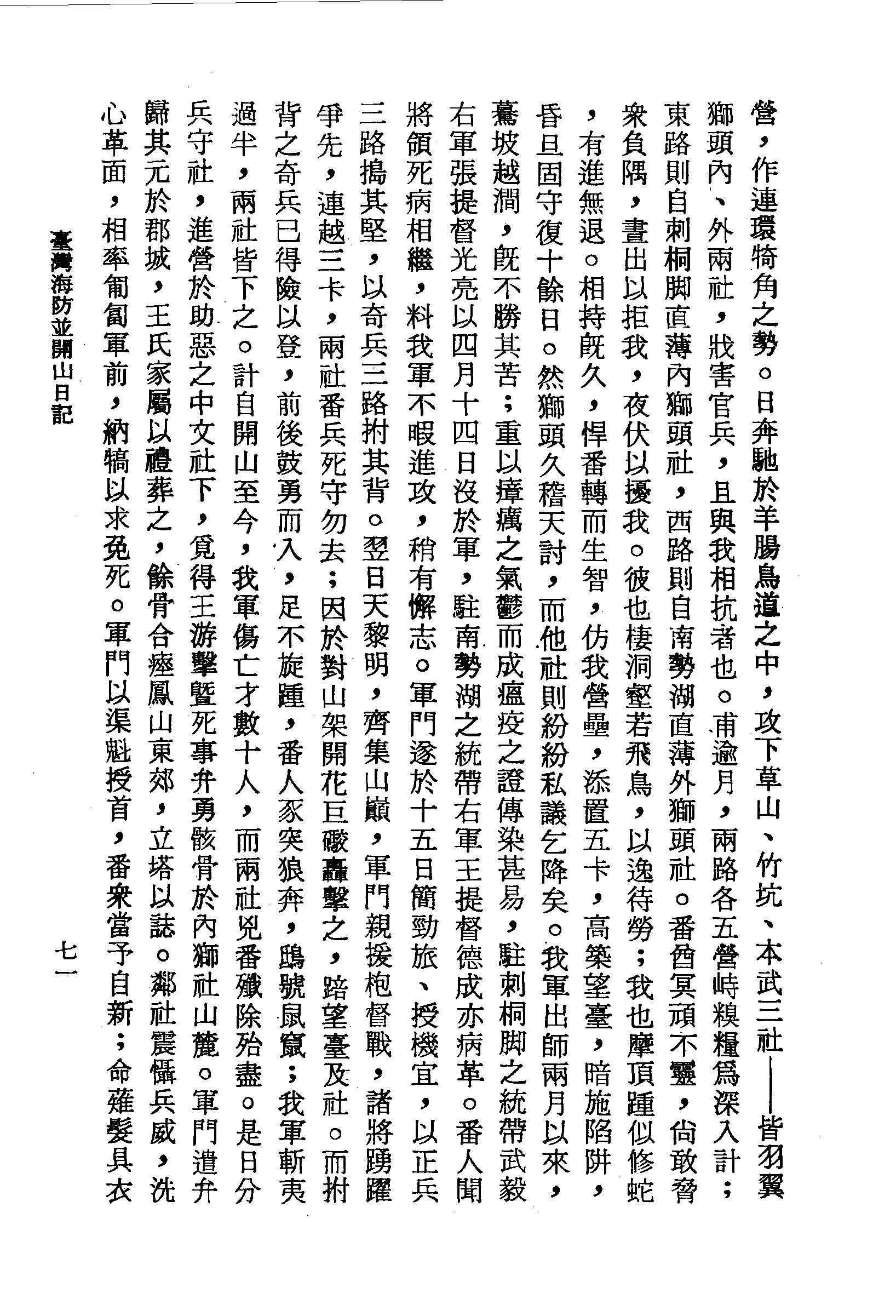 我軍出師兩月以來,驀坡越澗,既不勝其苦;重以瘴癘之氣鬱而成瘟疫之證傳染甚易,駐刺桐腳之統帶武毅右軍張提督光亮以四月十四日沒於軍,駐南勢湖之統帶右軍王提督德成亦病革。番人聞將領死病相繼,料我軍不暇進攻,稍有懈志。