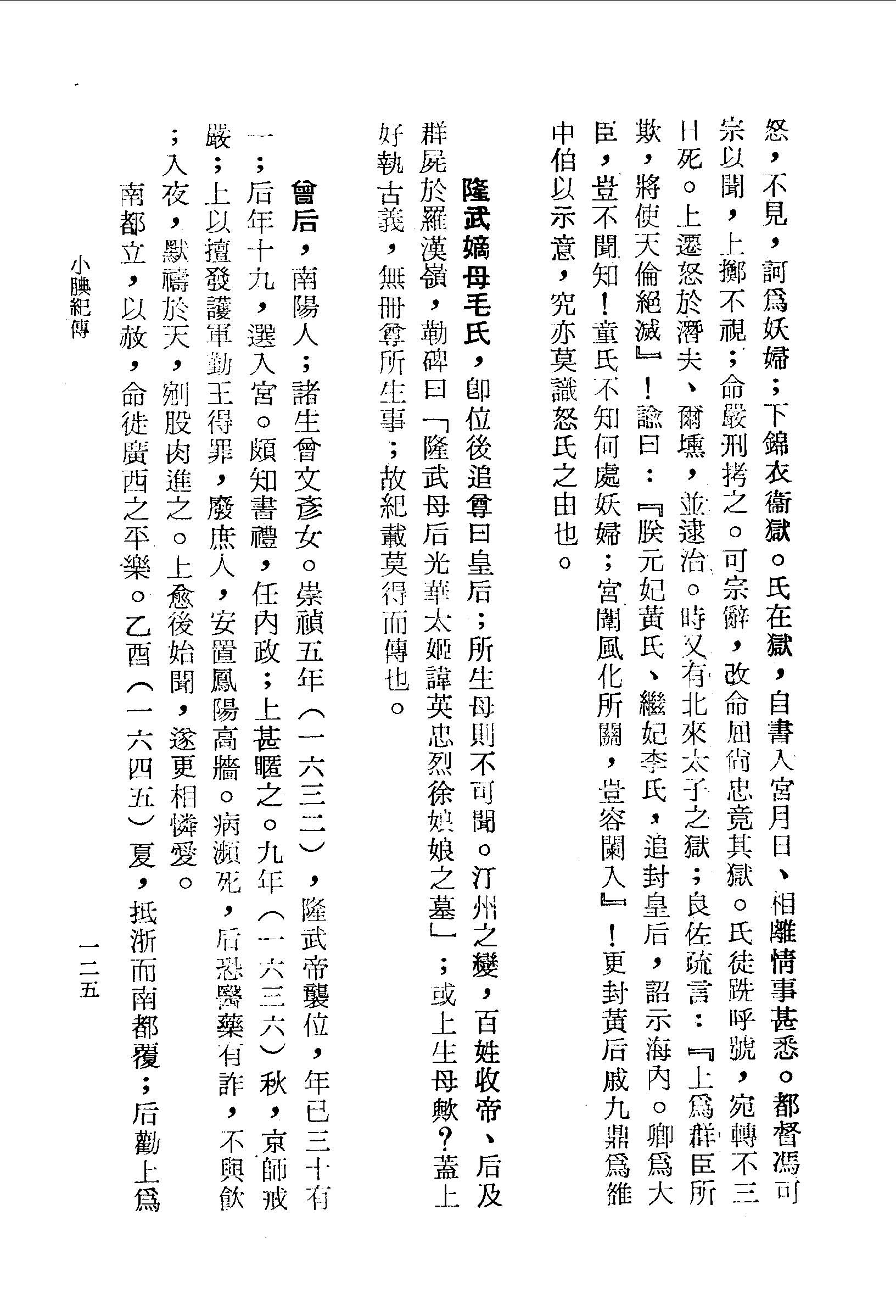 九年(一六三六)秋,京師戒嚴;上以擅發護軍勤王得罪,廢庶人,安置鳳陽高牆。病瀕死,后恐醫藥有詐,不與飲;入夜,默禱於天,剜股肉進之。上愈後始聞,遂更相憐愛。