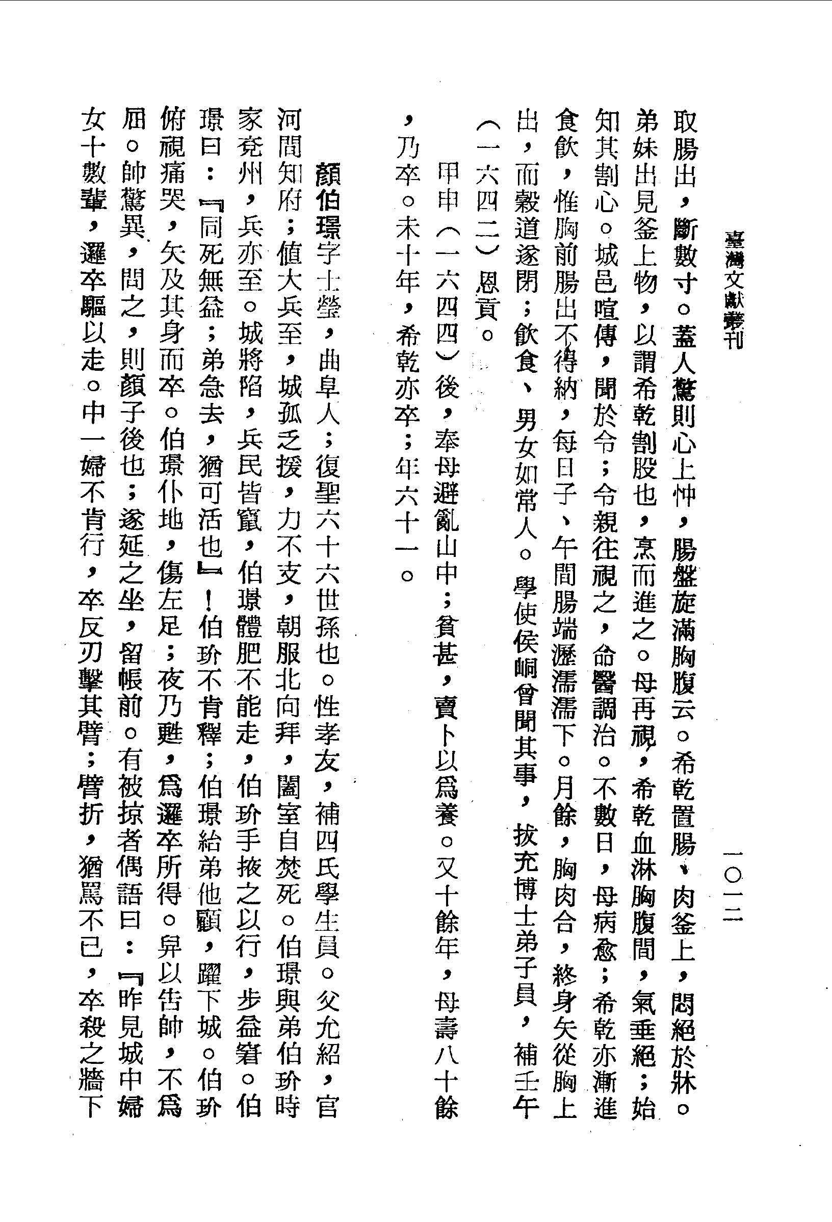 母再視,希乾血淋胸腹間,氣垂絕;始知其割心。城邑喧傳,聞於令;令親往視之,命醫調治。不數日,母病愈;希乾亦漸進食飲,惟胸前腸出不得納,每日子、午間腸端瀝濡濡下。