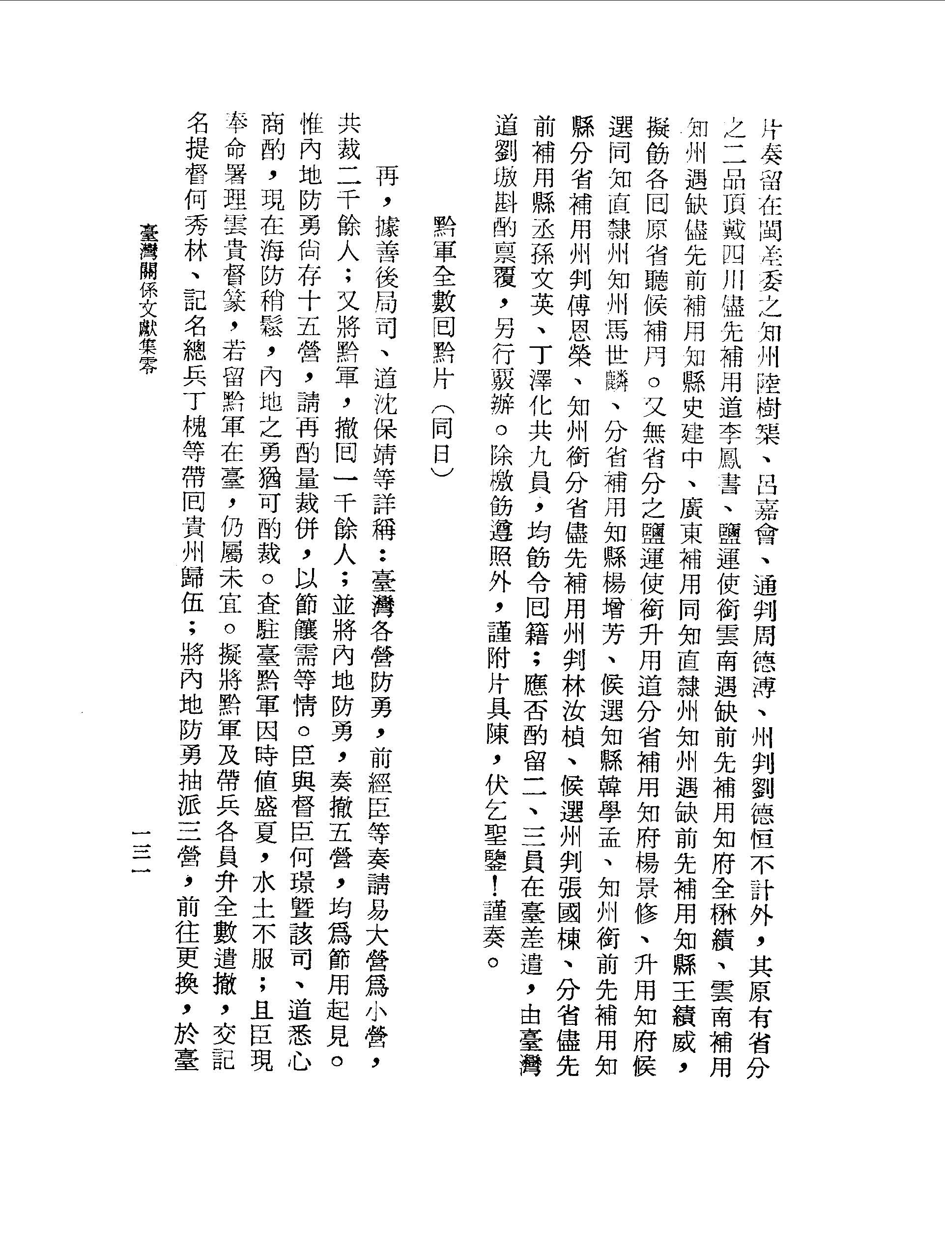查駐臺黔軍因時值盛夏,水土不服;且臣現奉命署理雲貴督篆,若留黔軍在臺,仍屬未宜。