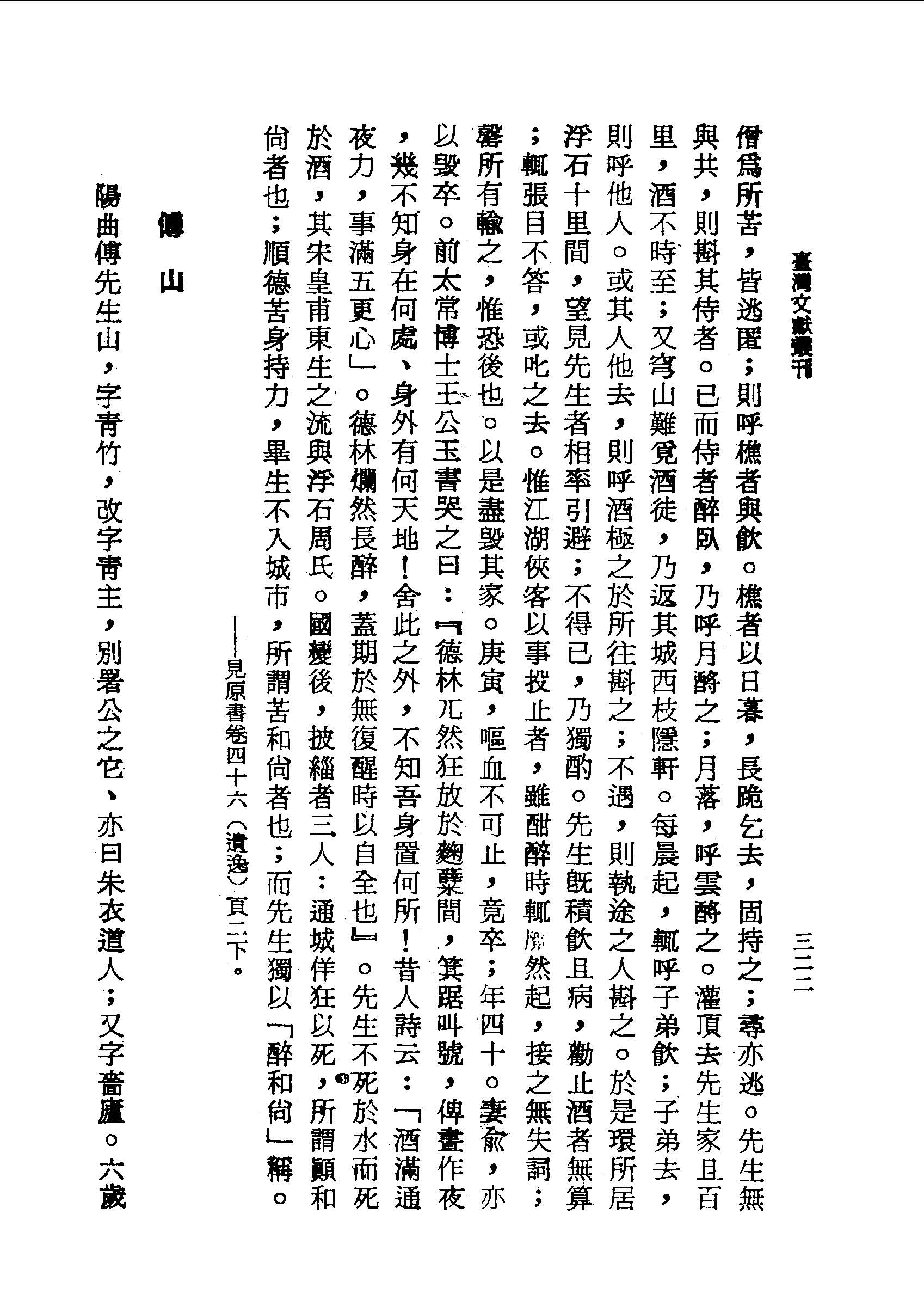 先生既積飲且病,勸止酒者無算;輒張目不答,或叱之去。惟江湖俠客以事投止者,雖酣醉時輒厥足然起,接之無失詞;罄所有輸之,惟恐後也。以是盡毀其家。庚寅,嘔血不可止,竟卒;年四十。