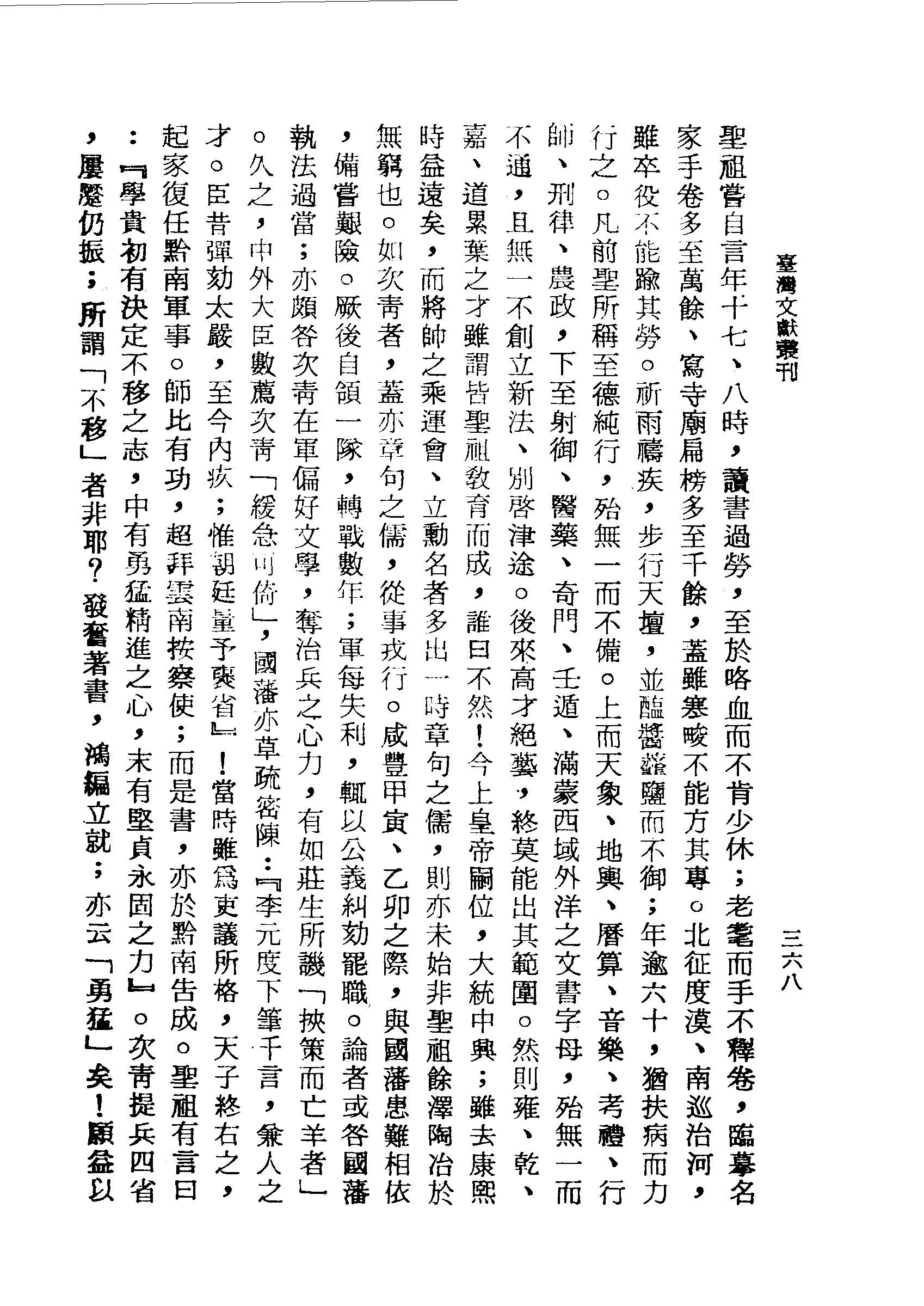 聖祖嘗自言年十七、八時,讀書過勞,至於咯血而不肯少休;老耄而手不釋卷,臨摹名家手卷多至萬餘、寫寺廟扁榜多至千餘,蓋雖寒畯不能方其專。北征度漠、南巡治河,雖卒役不能踰其勞。祈雨禱疾,步行天壇,並醢醬虀鹽而不御;年逾六十,猶扶病而力行之。