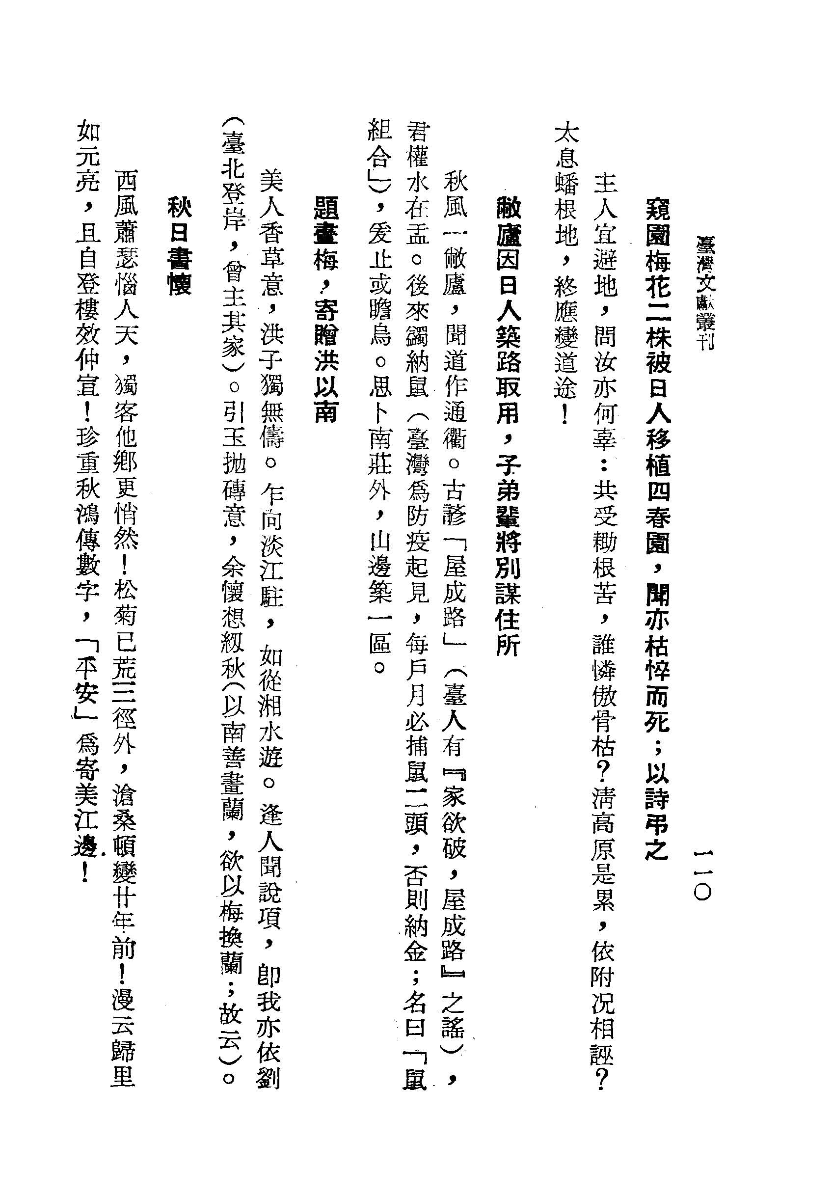 後來蠲納鼠(臺灣為防疫起見,每戶月必捕鼠二頭,否則納金;名曰「鼠組合」),爰止或瞻烏。