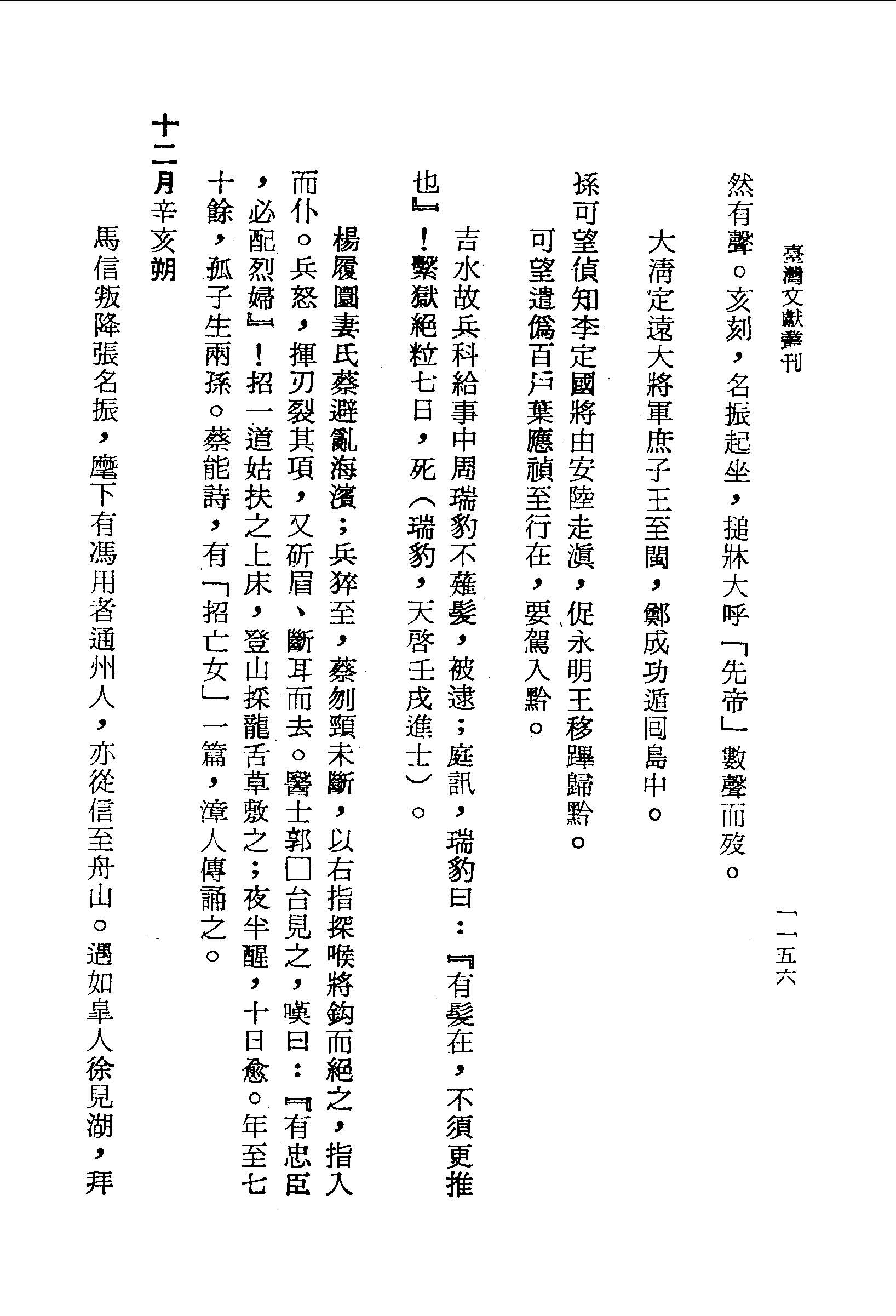 楊履圜妻氏蔡避亂海濱;兵猝至,蔡刎頸未斷,以右指探喉將鉤而絕之,指入而仆。兵怒,揮刃裂其項,又斫眉、斷耳而去。醫士郭□台見之,嘆曰:『有忠臣,必配烈婦』!招一道姑扶之上床,登山採龍舌草敷之;夜半醒,十日愈。年至七十餘,孤子生兩孫。