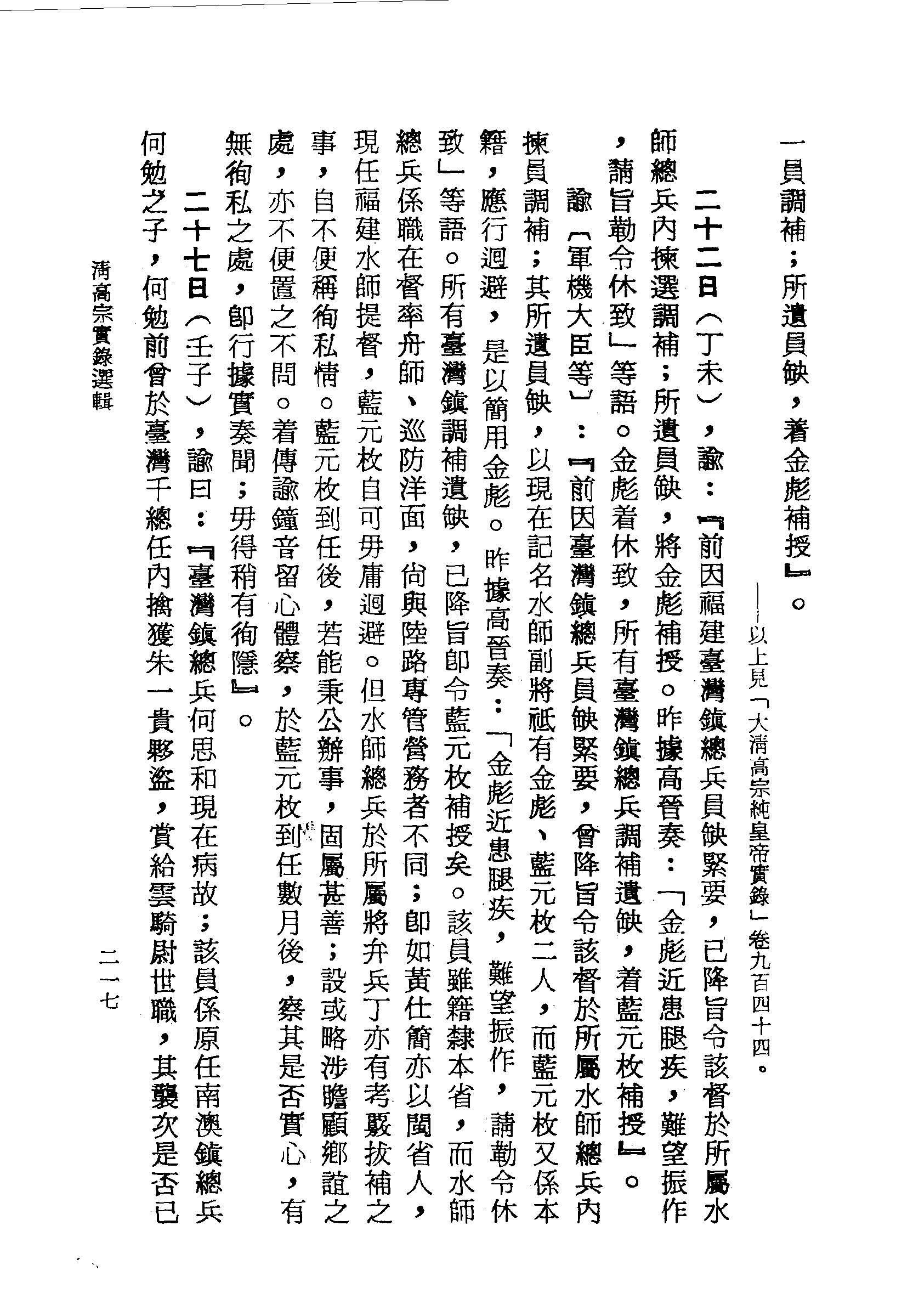 昨據高晉奏:「金彪近患腿疾,難望振作,請勒令休致」等語。所有臺灣鎮調補遺缺,已降旨即令藍元枚補授矣。