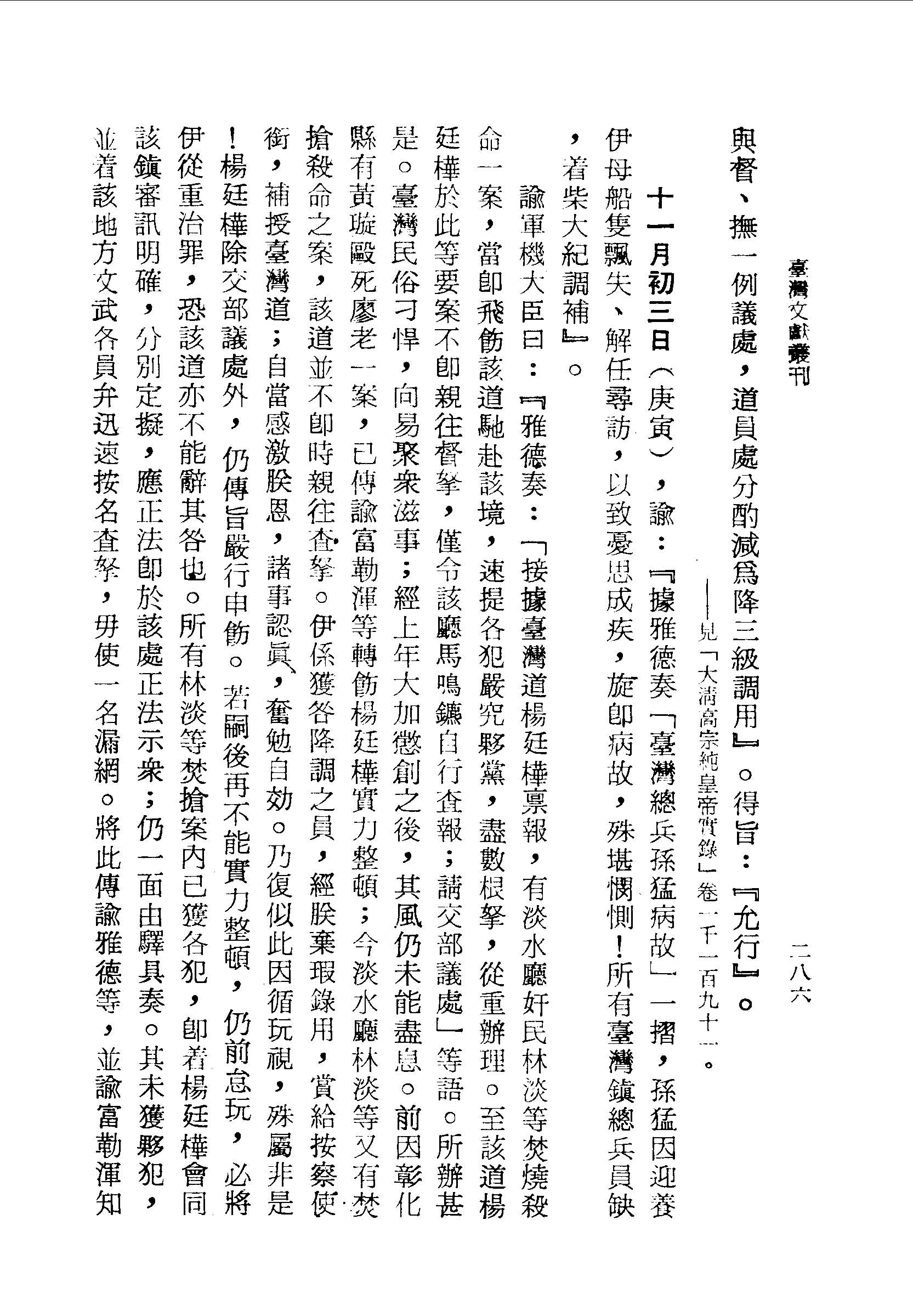 十一月初三日(庚寅),諭:『據雅德奏「臺灣總兵孫猛病故」一摺,孫猛因迎養伊母船隻飄失、解任尋訪,以致憂思成疾,旋即病故,殊堪憫惻!所有臺灣鎮總兵員缺,著柴大紀調補』。