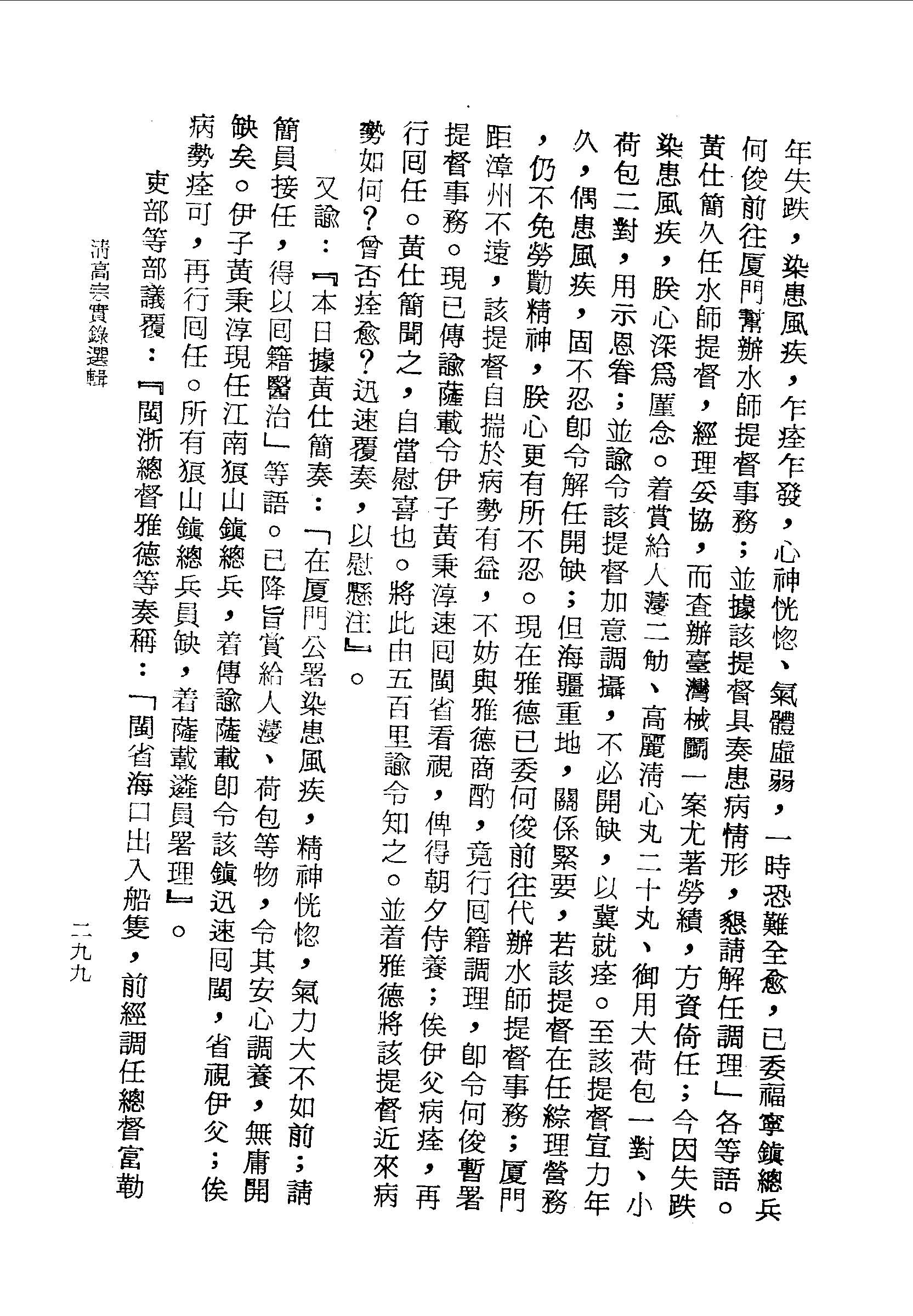據雅德奏:「福建水師提督黃仕簡自上年失跌,染患風疾,乍痊乍發,心神恍惚、氣體虛弱,一時恐難全愈,已委福寧鎮總兵何俊前往廈門幫辦水師提督事務;並據該提督具奏患病情形,懇請解任調理」各等語。黃仕簡久任水師提督,經理妥協,而查辦臺灣械鬥一案尤著勞績,方資倚任;今因失跌染患風疾,朕心深為厪念。著賞給人浸二觔、高麗清心丸二十丸、御用大荷包一對、小荷包二對,用示恩眷;並諭令該提督加意調攝,不必開缺,以冀就痊。至該提督宣力年久,偶患風疾,固不忍即令解任開缺;但海疆重地,關係緊要,若該提督在任綜理營務,仍不免勞勩精神,朕心更有所不忍。