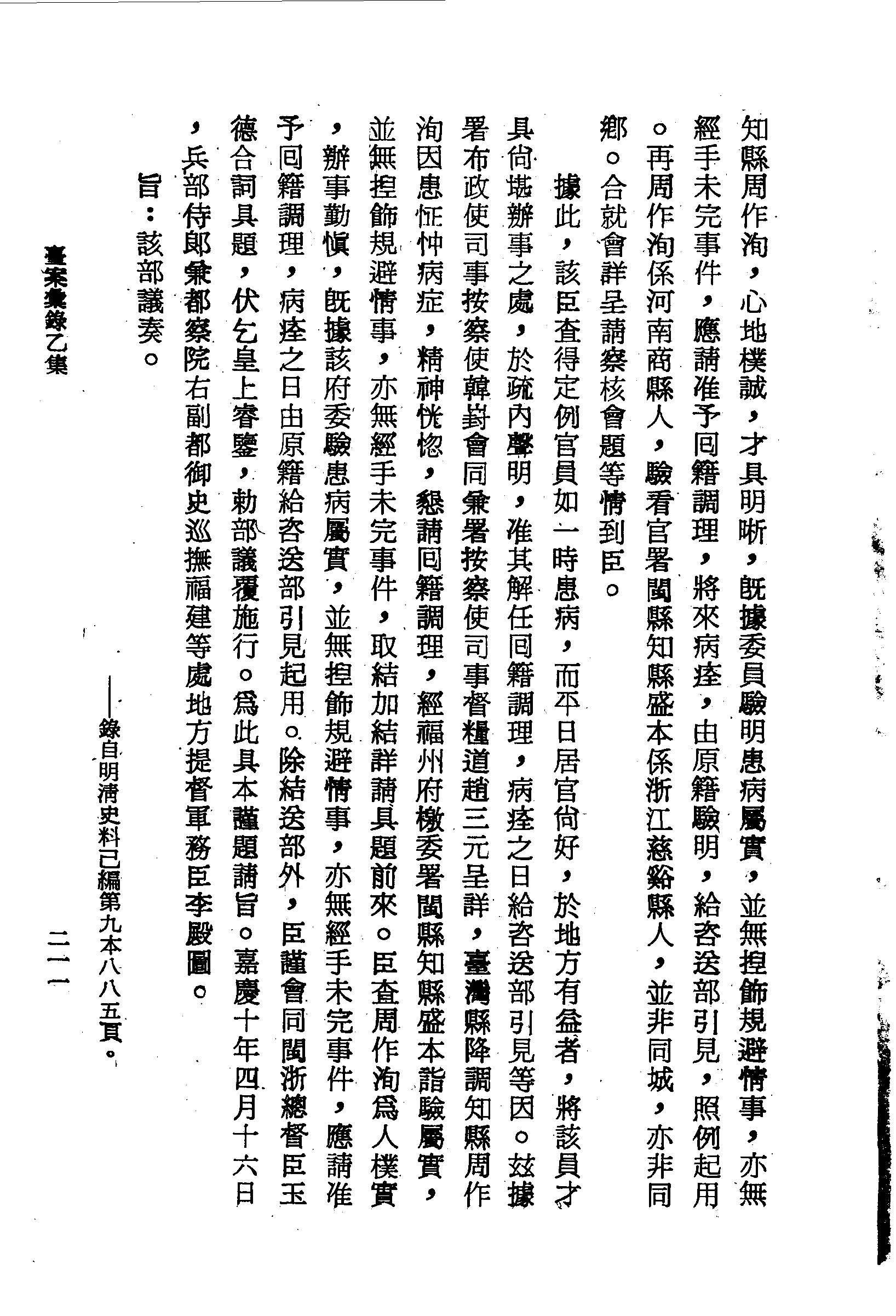茲據署布政使司事按察使韓崶會同兼署按察使司事督糧道趙三元呈詳,臺灣縣降調知縣周作洵因患怔忡病症,精神恍惚,懇請回籍調理,經福州府檄委署閩縣知縣盛本詣驗屬實,並無捏飾規避情事,亦無經手未完事件,取結加結詳請具題前來。