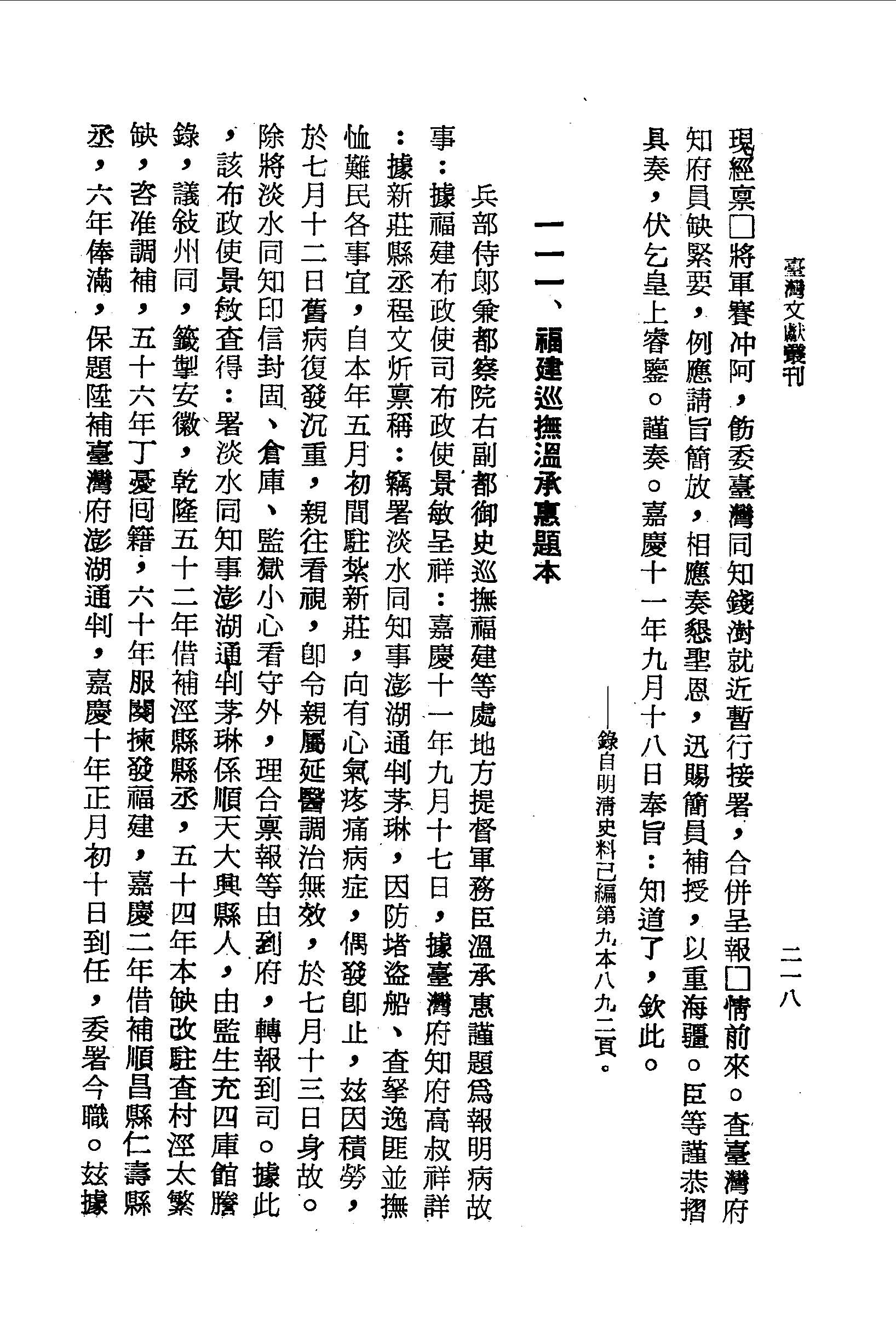 竊署淡水同知事澎湖通判茅琳,因防堵盜船、查拏逸匪並撫恤難民各事宜,自本年五月初間駐紮新莊,向有心氣疼痛病症,偶發即止,茲因積勞,於七月十二日舊病復發沉重,親往看視,即令親屬延醫調治無效,於七月十三日身故。